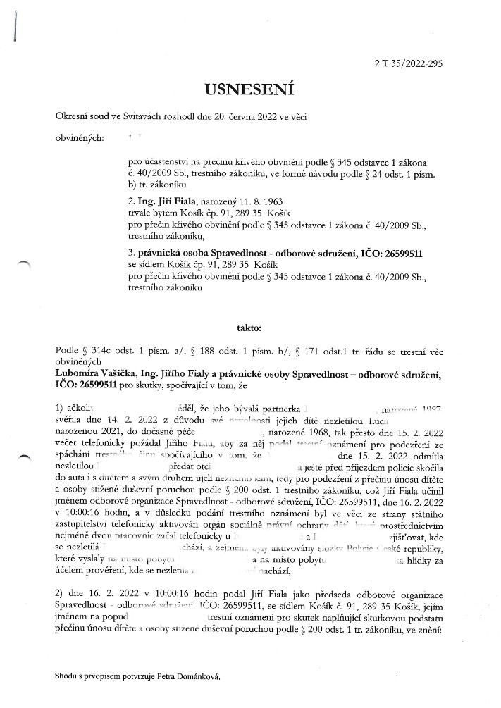 Příl. : - Usnesení OS Svitavy č.j. 2 T 35/2022 ze dne 20.6. 2022