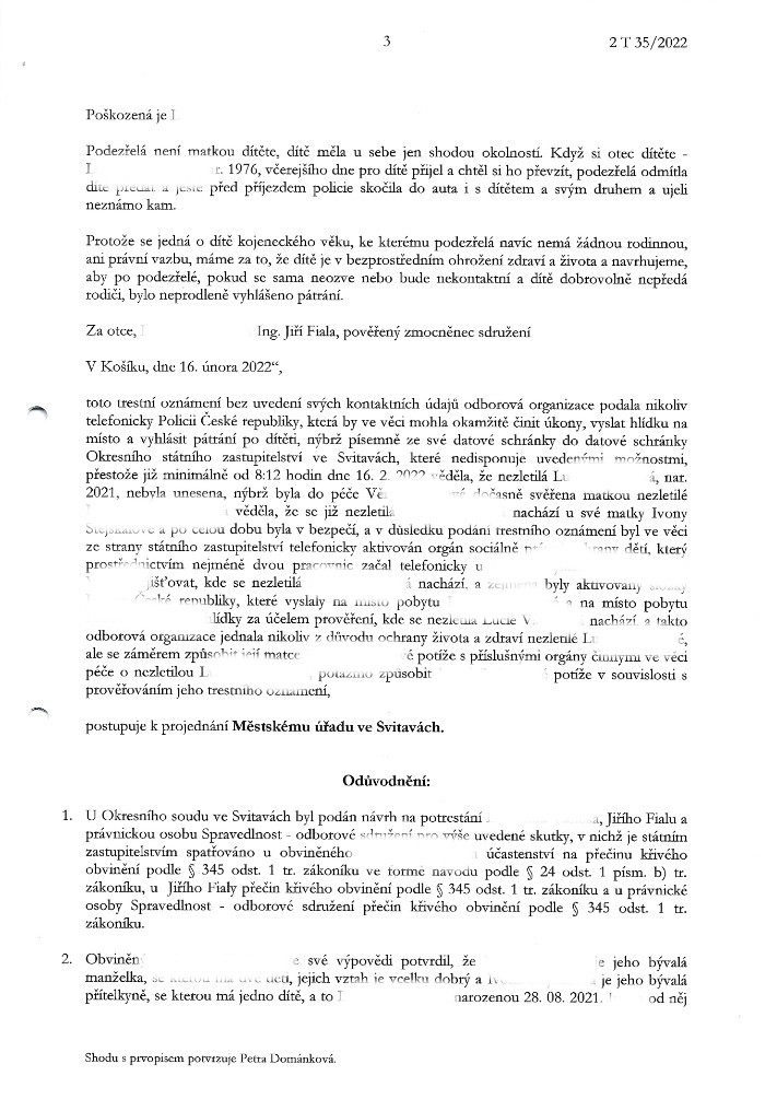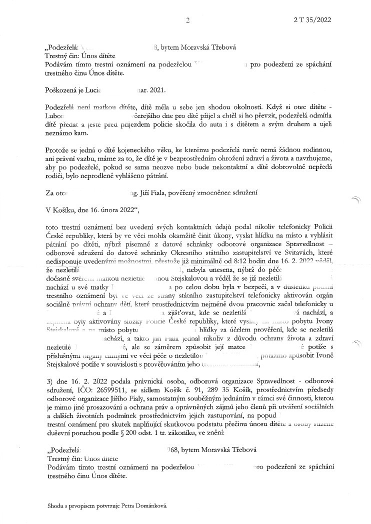 „přestože minimálně od 8:12 hod 16. 2. 2022 věděl, že nezletilá Lucie Vašíčková nebyla unesena, nýbrž se nachází u své matky …“