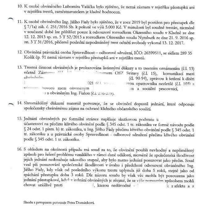 Popsaná motivace údajných „pachatelů“, kterým prý mělo jít o to, aby se mstili matce, případně osobě, jež měla dítě v neoprávněné držbě, jasně reflektuje pouze mravní úroveň soudkyně samé, kdy „podle sebe soudím tebe“. Ve skutečnosti totiž ani mně, natož pak odborovému sdružení, nešlo o nic jiného než o přesné prosazení a dodržení zákona, a tedy i navrácení dítě tam, kam patří - tedy jeho rodičům nebo rodiči, který je momentálně schopen o dítě pečovat - a jsem naprosto v šoku z toho, co je možné ve Svitavách z toho dovozovat, pronásledovat nevinné a - na rozdíl od justice - řádně vzdělané lidi, hrabat se a šťourat se bezdůvodně v jejich minulosti, kterou navíc evidentně neumí dotyčné interpretovat a popisovat spáchání neexistujících trestných činů, svědčící pouze a výhradně o totální profesní deformaci a degradaci dotyčných.