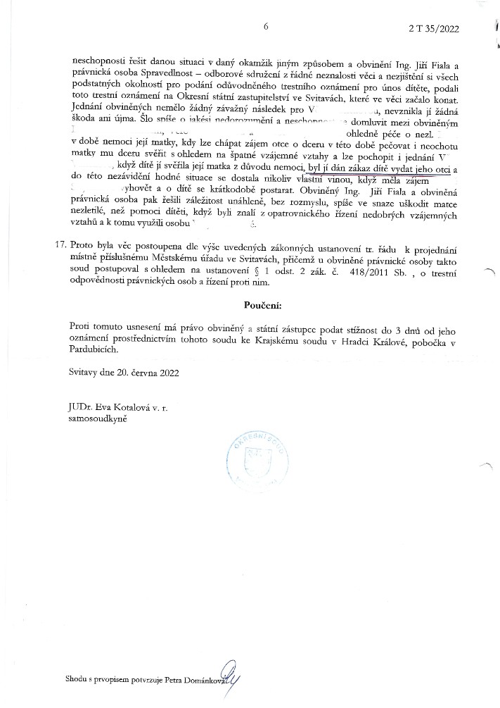 a to uváděním vědomě nepravdivých dehonestujících skutečností do úředního dokumentu - Usnesení OS Svitavy č.j. 2 T 35/2022 ze dne 20.6. 2022 - JUDr. Eva Kotalová.
