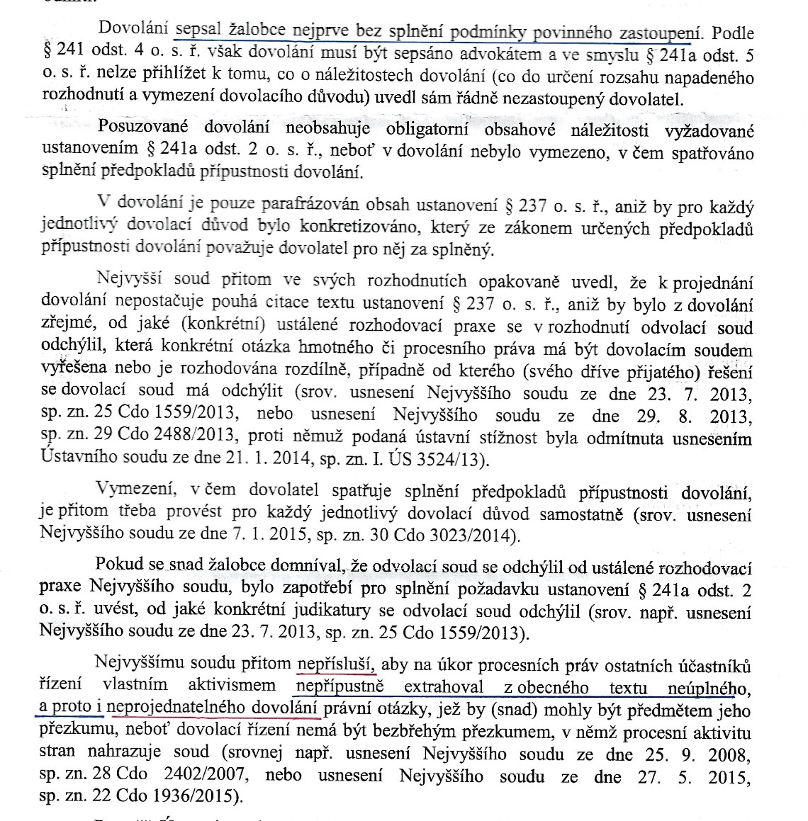 Jestliže úředně přidělený advokát nedokáže splnit ani základní body pro přijatelnost dovolání, je naprosto k ničemu a měly by se z toho dovodit důsledky. Mimo jiné také takové, že - po zrušení povinného zastoupení - se na stránkách soudu zveřejní stručné požadavky soudu na dovolání, a každý dovolatel, který má JAKÝKOLIV VŠ titul, napříště nebude povinné zastoupení potřebovat jako nadbytečné.