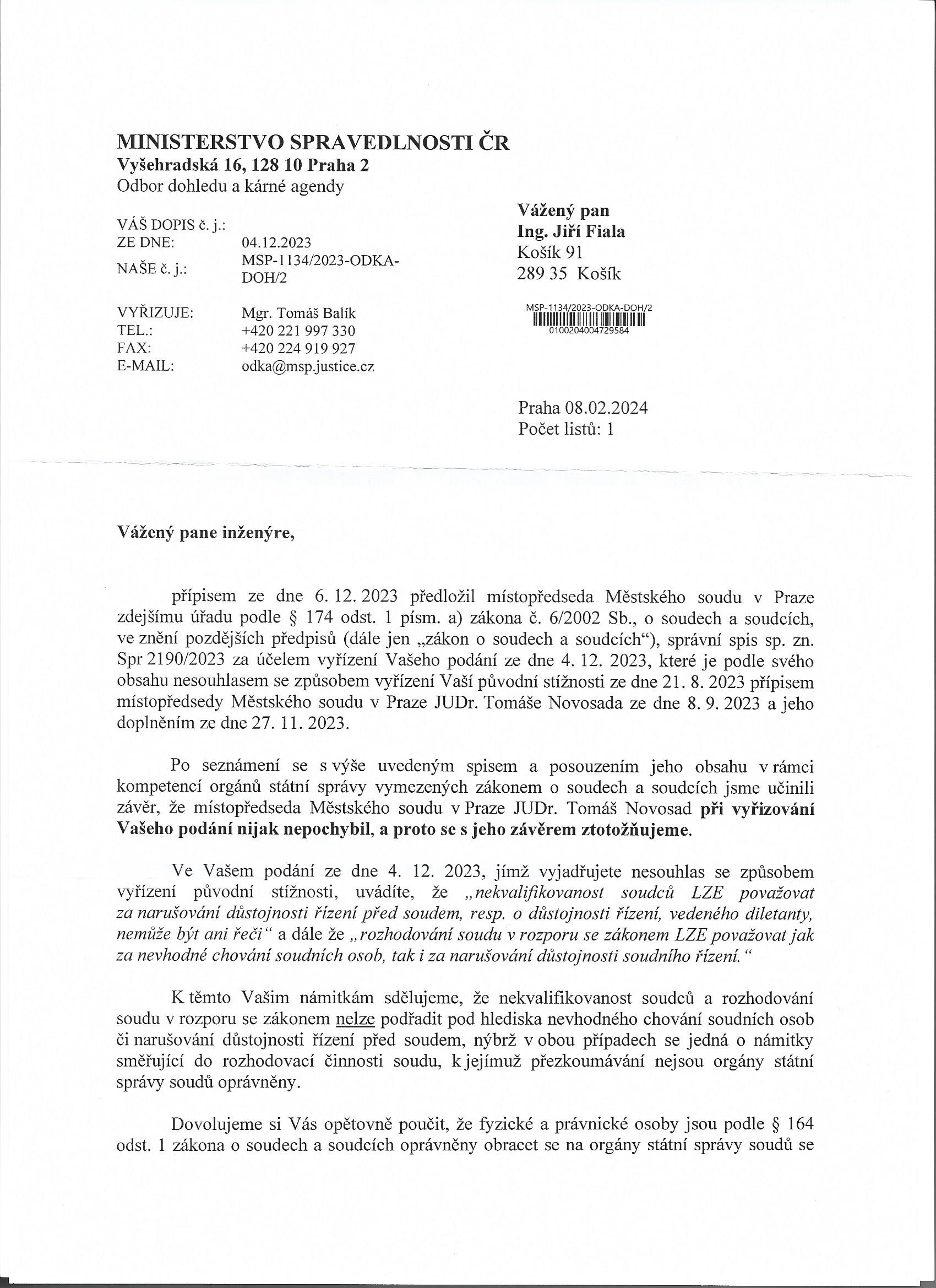 Teď, když MSp jako obvykle selhalo, čímž jste vyčerpal dle ombudsmana příslušný prostředek nápravy, máte možnost podat stížnost a kárný podnět na Novosada přímo u ombudsmana jako kárného žalobce dle zákona č. 7/2002Sb. se současným uvedením, že MSp jen kolaboruje s kárně podezřelým Novosadem.