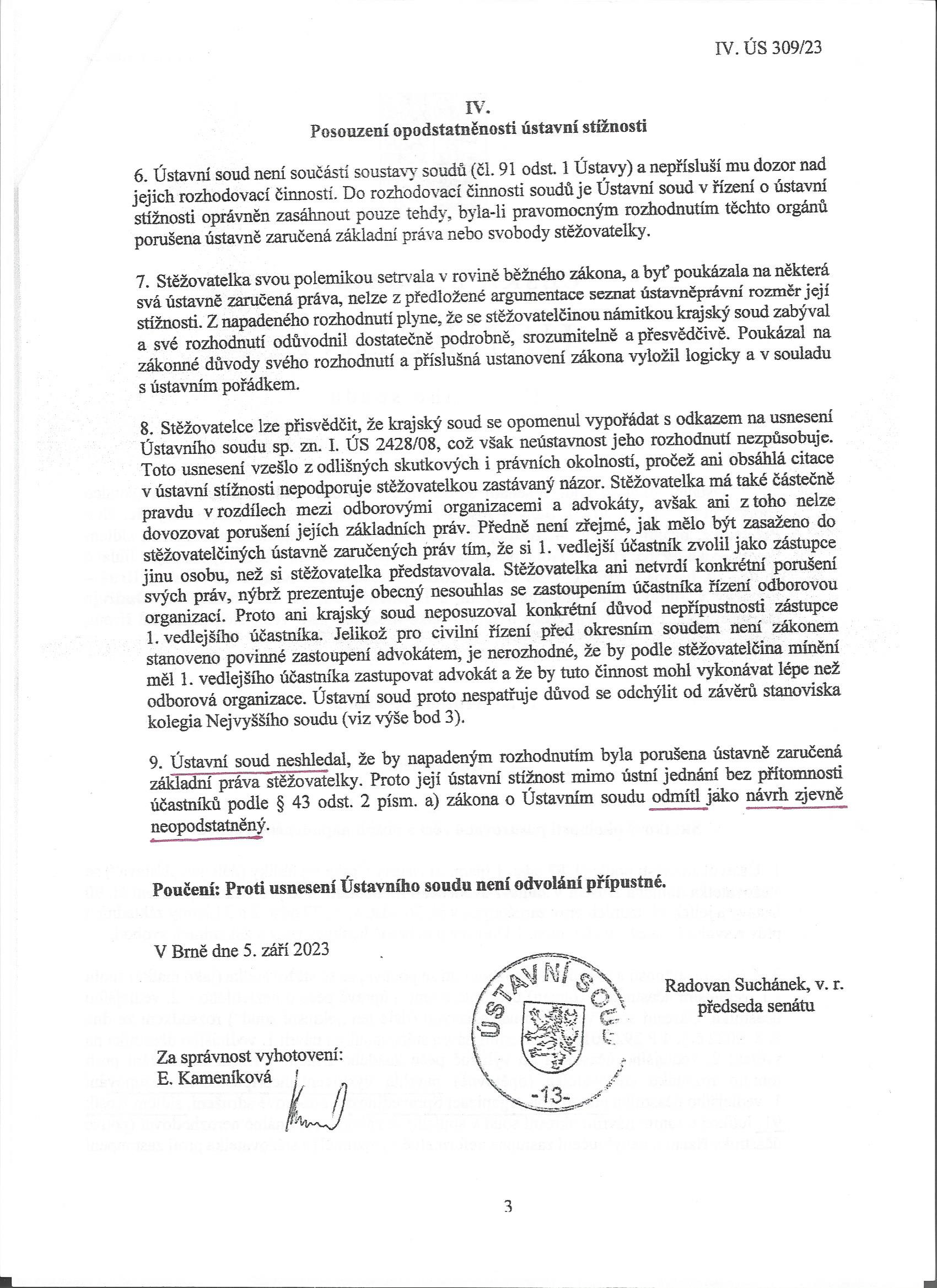 Možná by bylo dobré uvést i trochu srozumitelněji o co stěžovatelce přesně šlo ne jenom ty 2 strany usnesení. (Co ty obecné kecy opět vložené jako omáčka o tom, že si budou na ústavním soudě určovat, co je nebo není dostatečně intenzivním zásahem do ústavou garantovaných práv? Jako by snad bylo někde v ústavě napsané, že porušení ústavy s větším množstvím následku, nikoliv malým, je neústavní, ale malé porušení ústavy neústavní není ...já to tam tedy nikde v zákoně nenalézám .... buď bylo porušeno právo a ústava postupem justice nebo nebylo ...paní to zabití při tom zákroku bylo takové malé to zabitím fakt není ani pohřeb vám ministerstvo neuhradí ....to víte, vaše dítě mělo jen malou výšku a jak víte soudci rozhodli že to je zabití až od metru padesát ....tedy až od větší osoby se o zabití jedná...... jo kdyby se jednalo o snížení platu o stokorunu ústavních soudců .. .to by bylo řevu o útoku na demokracii a právní stát a ústavní práva....)