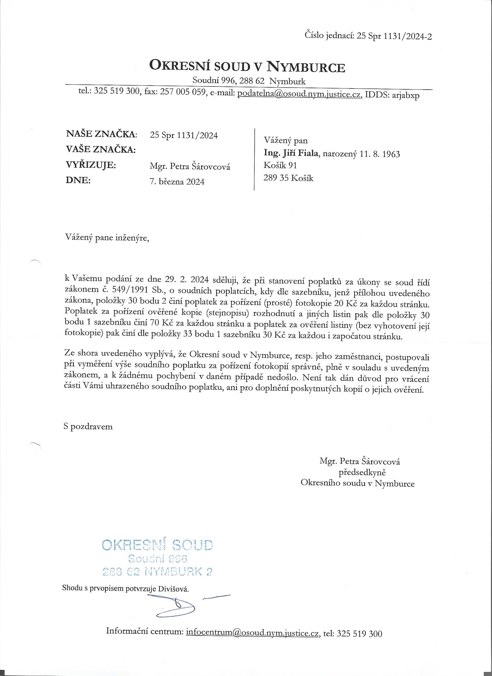 Současně mi nezbylo, než napsat upozornění MSp, jaký neskutečný - degenerativní - bordel má na soudě v Nymburce, kde ještě před pár lety, když už nic, tak aspoň kopie nebyly problém.