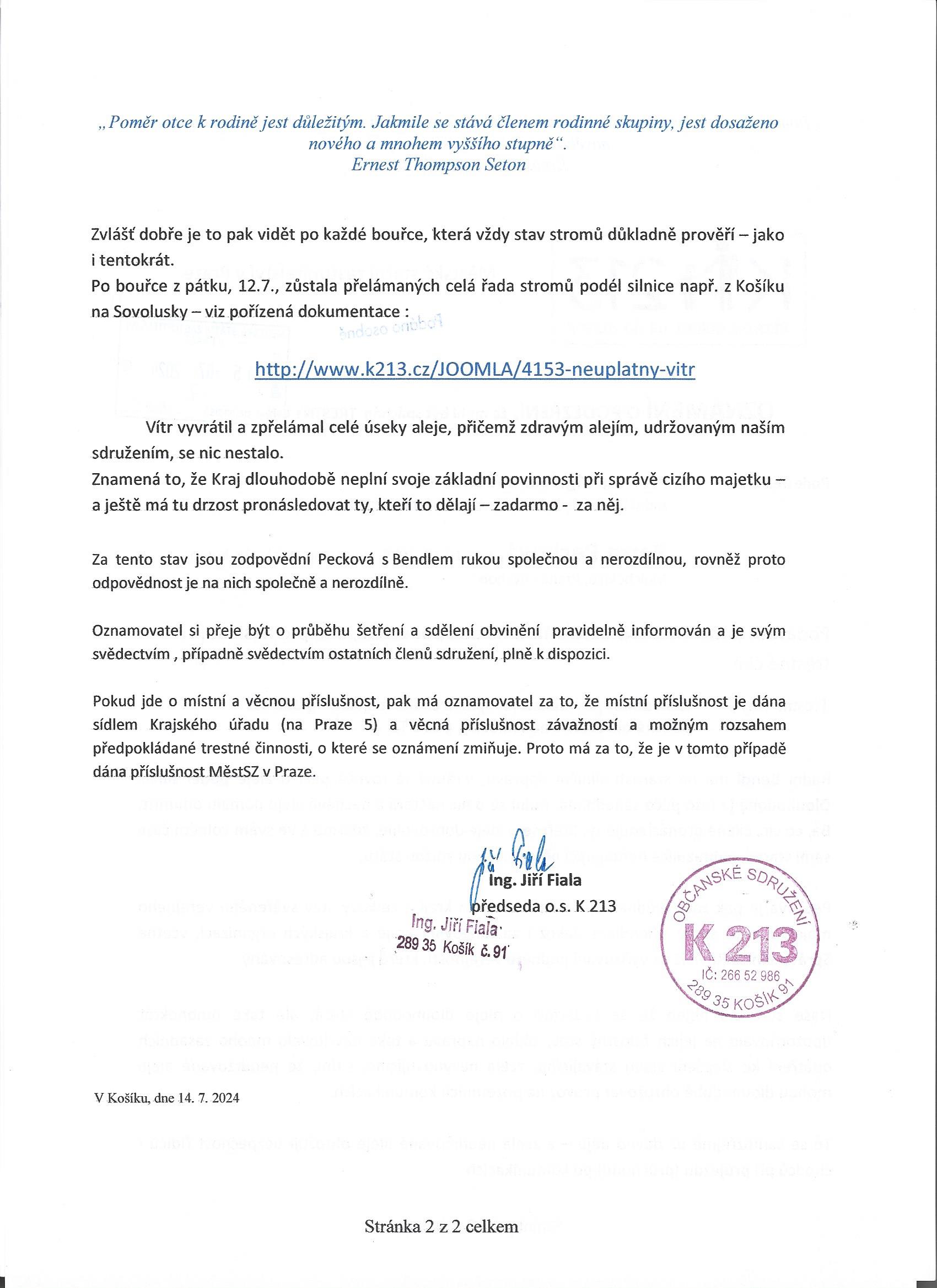 Rozlámané stromy byly zdokumentovány - již z fotek je jasné, že se nejednalo o žádnou nahodilou událost, ale o dlouhodobě zanedbanou, anebo zcela diletantskou péči - a následně bude podáno JIŽ DRUHÉ TRESTNÍ OZNÁMENÍ na hejtmanku Peckovou a radního Bendla, kteří mají tuto péči v popisu práce, a to pro HRUBÉ ZANEDBÁNÍ POVINNOSTÍ PŘI SPRÁVĚ CIZÍHO MAJETKU a dále i pro OBECNÉ OHROŽENÍ, protože jen zázrakem žádný z těch stromů nespadnul na kolem projíždějící auta.