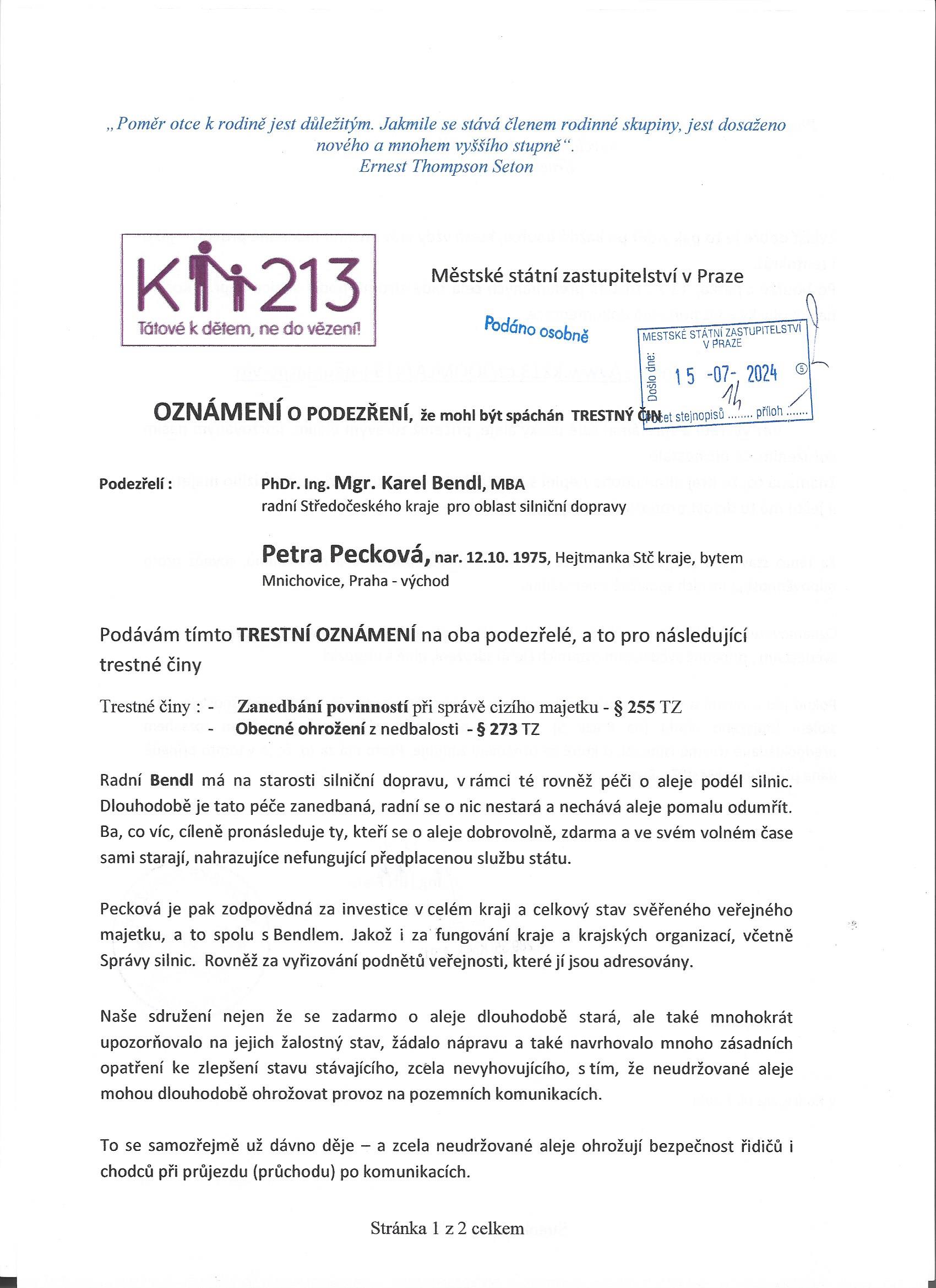 Po podání bude zveřejněno i TRESTNÍ OZNÁMENÍ na Bendla a Peckovou.