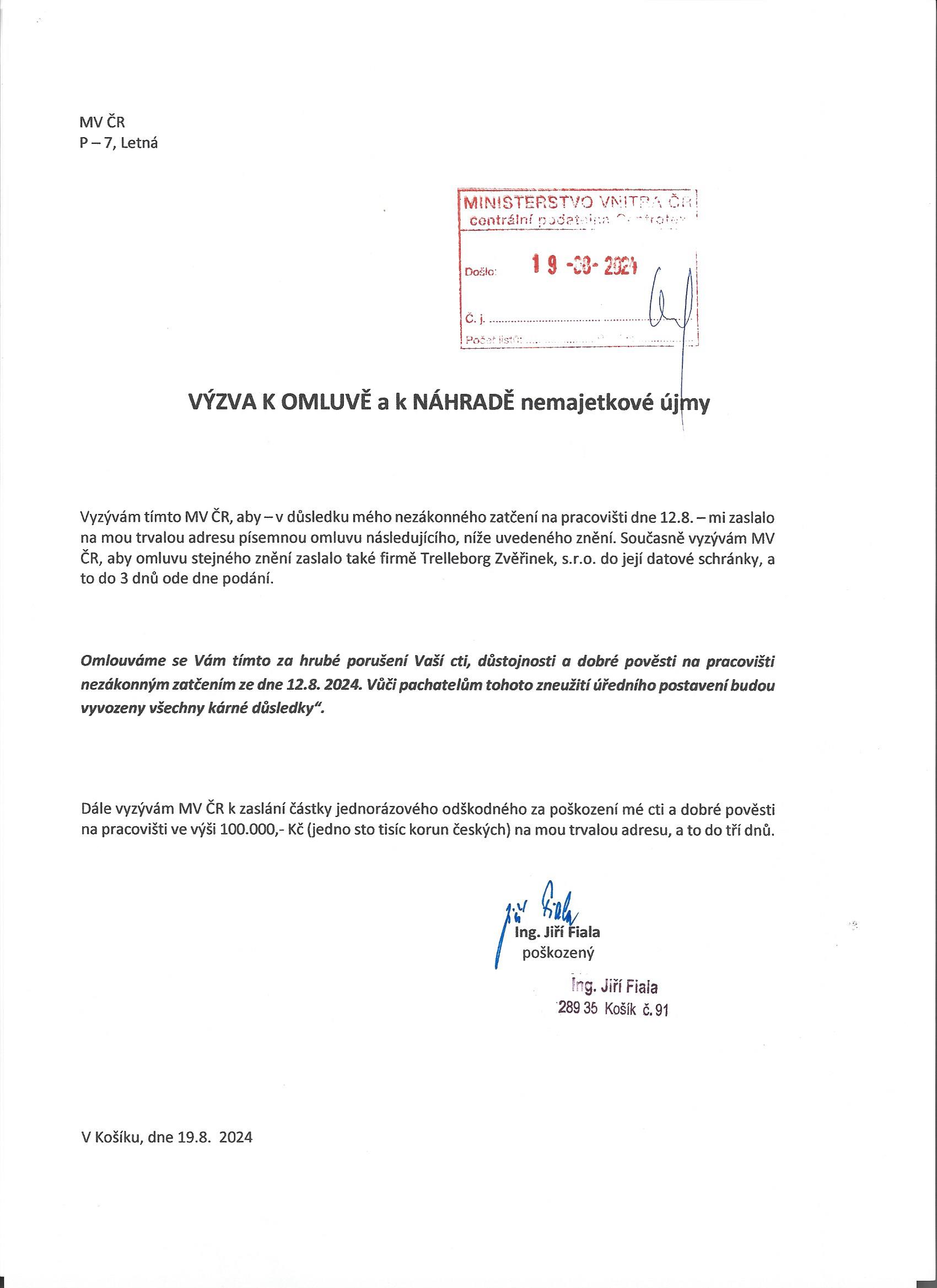 „Omlouváme se Vám tímto za hrubé porušení Vaší cti, důstojnosti a dobré pověsti na pracovišti nezákonným zatčením ze dne 12.8. 2024. Vůči pachatelům tohoto zneužití úředního postavení budou vyvozeny všechny kárné důsledky“.