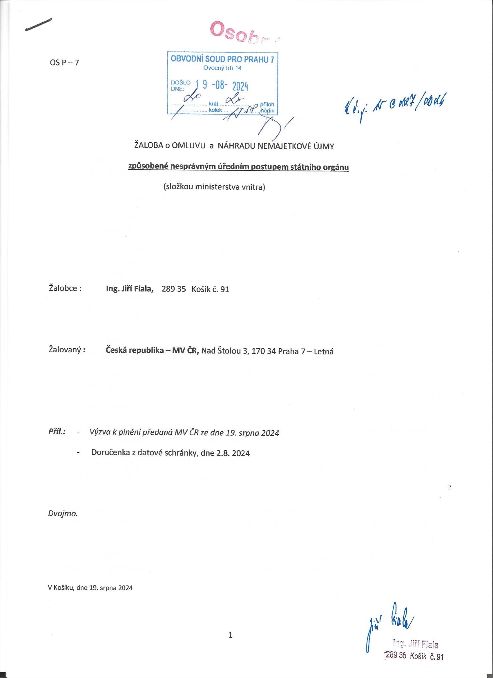 Žalobce, vzhledem ke zjevnému porušení zákona, trestního řádu a nepřiměřenosti a neodůvodněnosti postupu policie požaduje po orgánech MV jednak omluvu, jednak finanční kompenzaci za cílené, úmyslné a svévolné poškození jeho dobrého jména u zaměstnavatele.