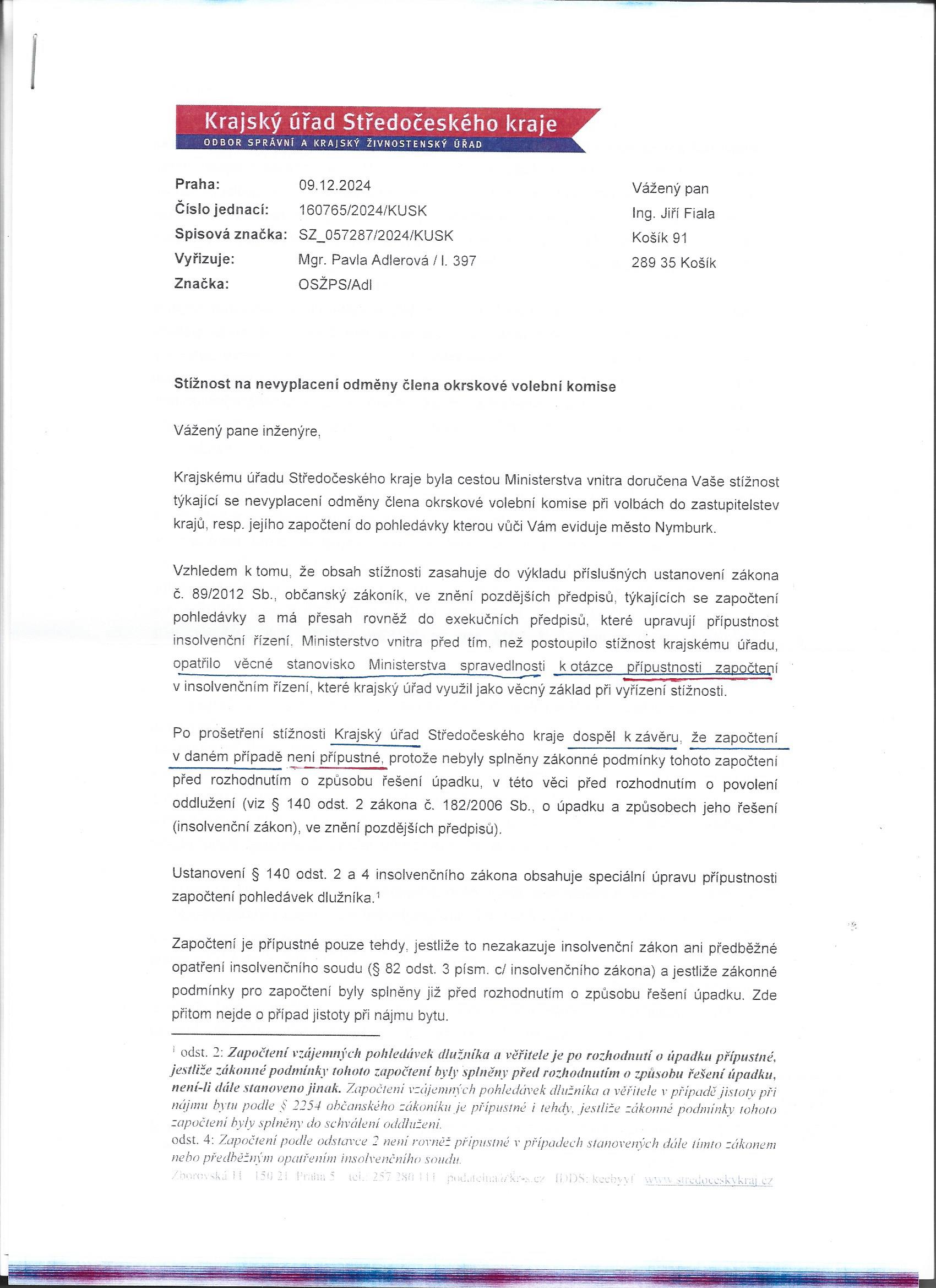 Jak naši členové - a čtenáři stránek obecně - dobře vědí, pokusil se Nymburk v říjnu o další naschvál, ubohostí hodný svých tvůrců - tedy Mejzrové s Machem. A to tím, že mi nevyplatil odměnu za volby, resp. za dvoudenní účast ve volební komisi - na kterou má každý člen ze zákona nárok.