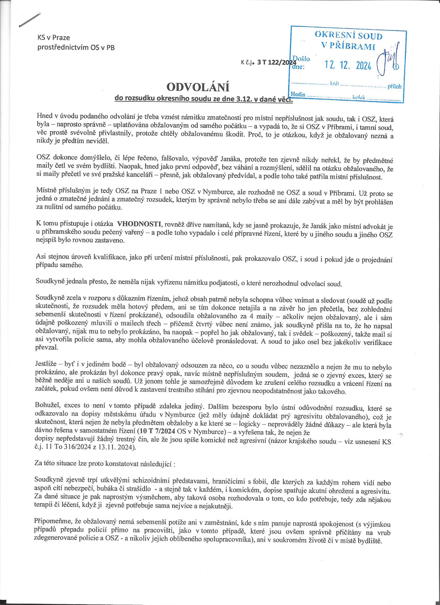 Obžalovaný tehdy podal trestní oznámení pro nebezpečné pronásledování, OSZ je nevyšetřovalo, protože prý Janák mluvil o návštěvě obžalovaného v lednu, o které věděl z INS rejstříku, nyní sám prokázal, že OSZ lže a že Janák měl na mysli květnovou návštěvu obžalovaného, o které mohl vědět buďto od INS správkyně, anebo ze sledování. Jiná možnost neexistuje.