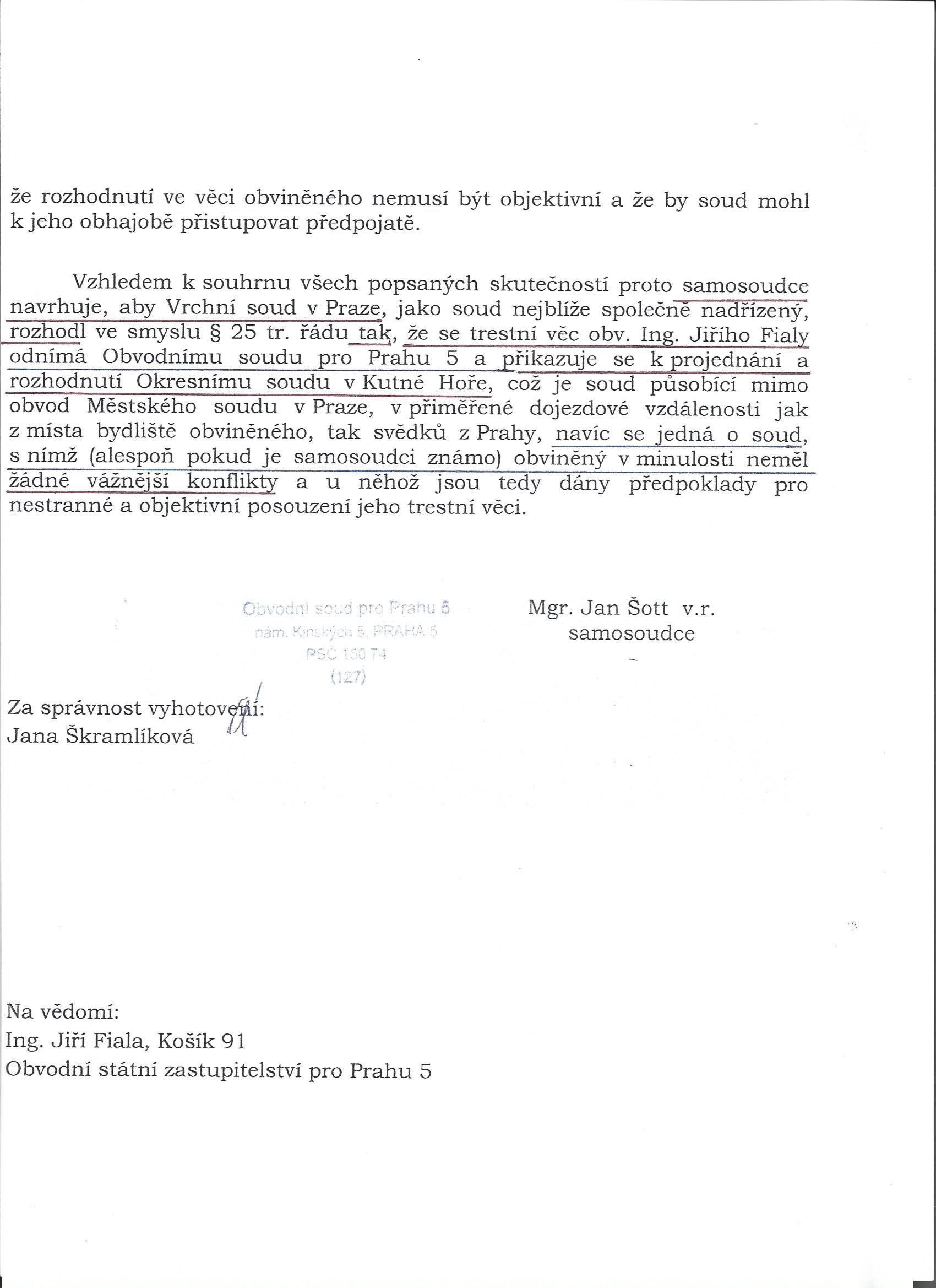 A tak se postupně vyloučil celý soud pro Prahu 10, následoval celý soud pro Prahu 3 - soudce po soudci, jeden za druhým, dodnes schraňuji jejich vylučovací usnesení jako cenný pomník padlých - všichni se najednou cítioli hrozně podjatí - a když vyloučili i posledního soudce na Praze 3, hodili to přes řeku, kde se mnou ještě nebyly tak bohaté zkušenosti - tedy na Prahu 5. A tam narazili právě na Šotta.