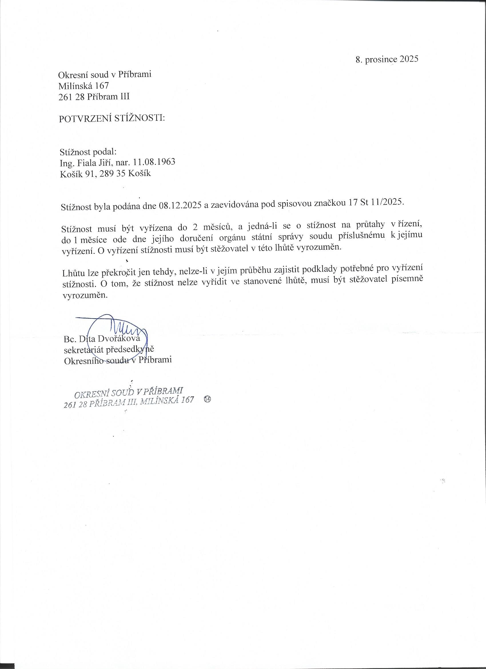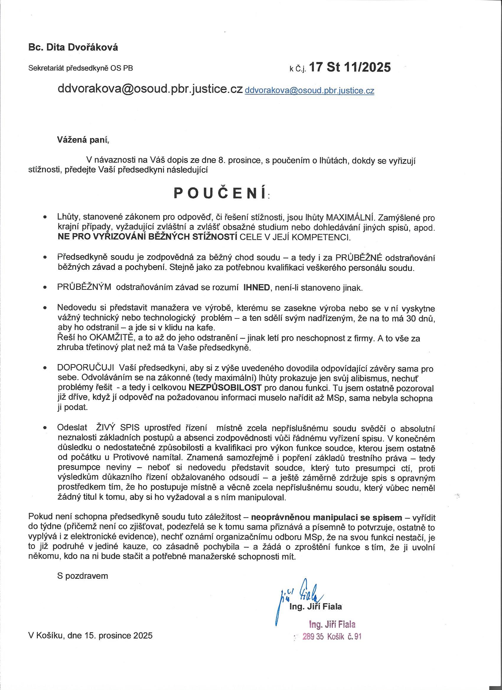 I soudu v Příbrami bylo nutno sdělit, jak a kdy se řeší problémy, včetně dostatečné kvalifikace soudkyně - a ne že na to má neomezený čas...