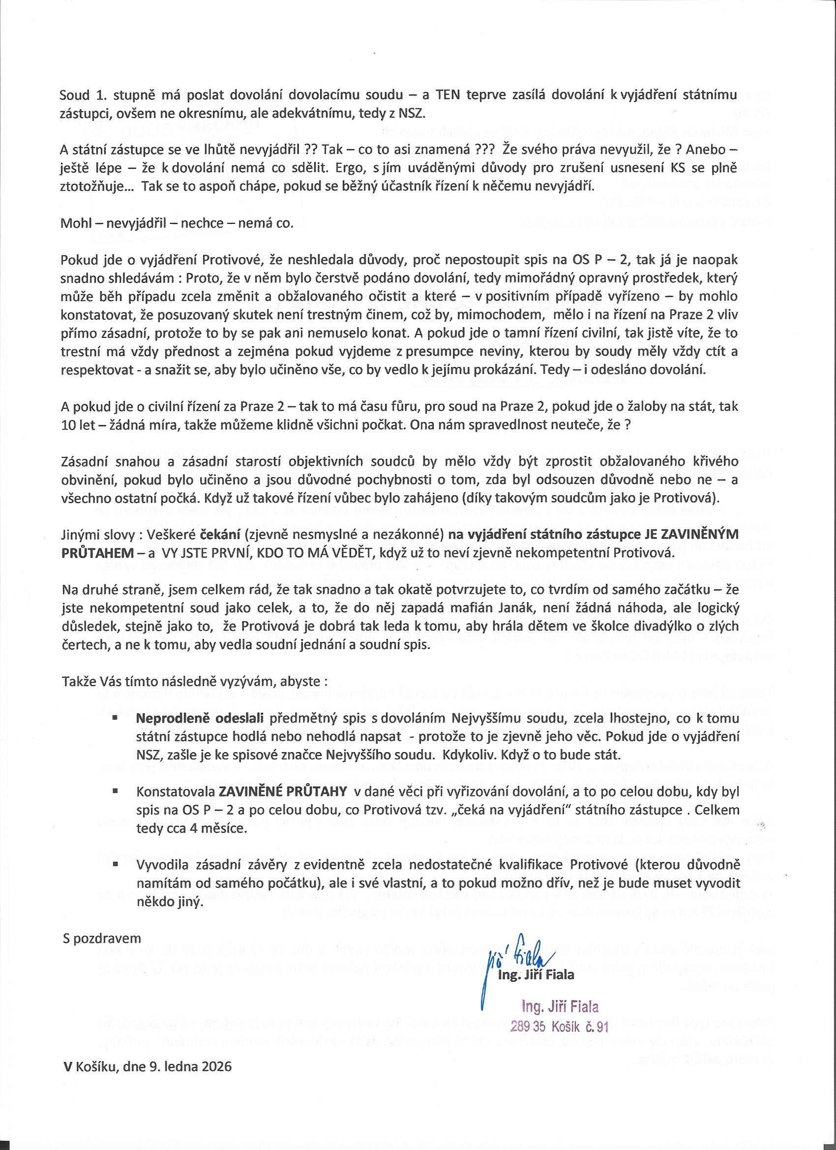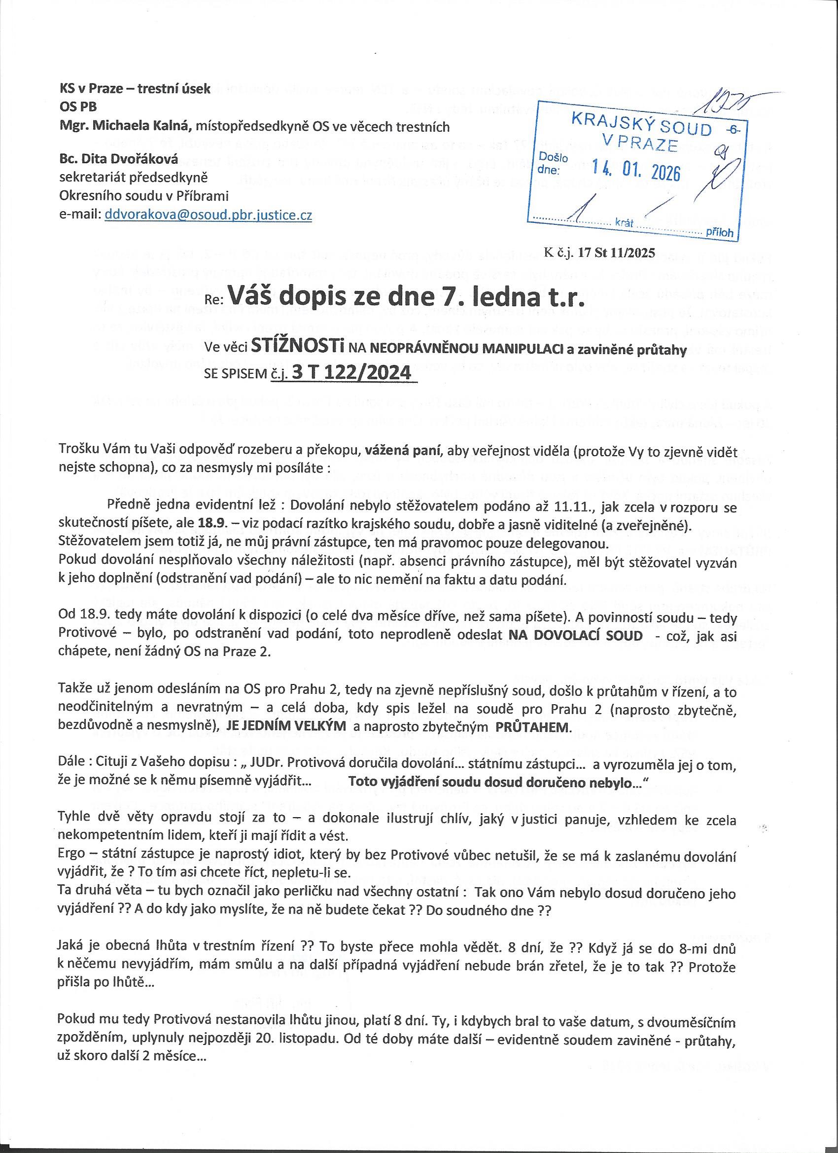Takže už jenom odesláním na OS pro Prahu 2, tedy na zjevně nepříslušný soud, došlo k průtahům v řízení, a to neodčinitelným a nevratným – a celá doba, kdy spis ležel na soudě pro Prahu 2 (naprosto zbytečně, bezdůvodně a nesmyslně), JE JEDNÍM VELKÝM a naprosto zbytečným PRŮTAHEM.
