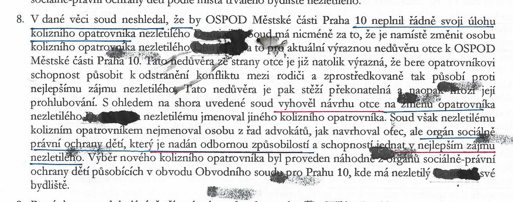 Za výše popsaného stavu, má soud za to, že : ... "Opatrovník nijak nepochybil a žádné závady v jeho péči neshledal". Přesto je soud takový grant, že otci tak jako tak vyhoví a opatrovníka vyloučí, ovšem zvoleného právníka rozhodně neustanoví, protože ten k tomu nemá odbornou způsobilost - zatímco opatrovník ze strany OSPOD ji má...