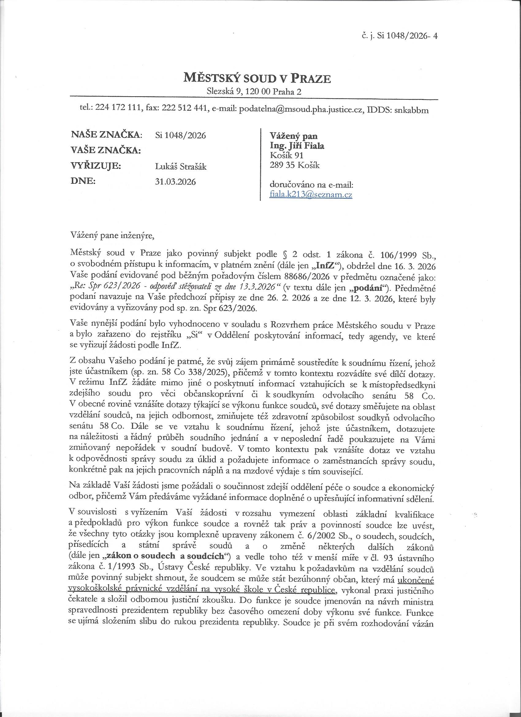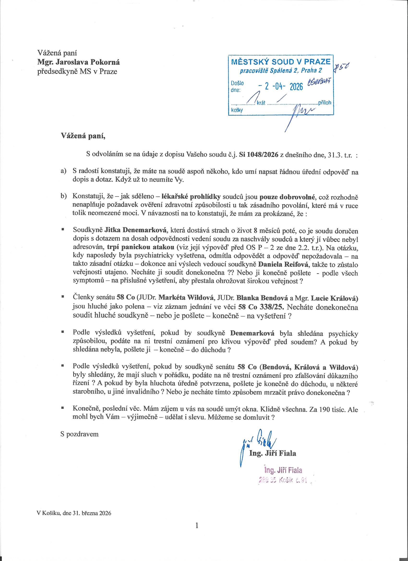 S odvoláním se na údaje z dopisu Vašeho soudu č.j. Si 1048/2026 z dnešního dne, 31.3. t.r. :