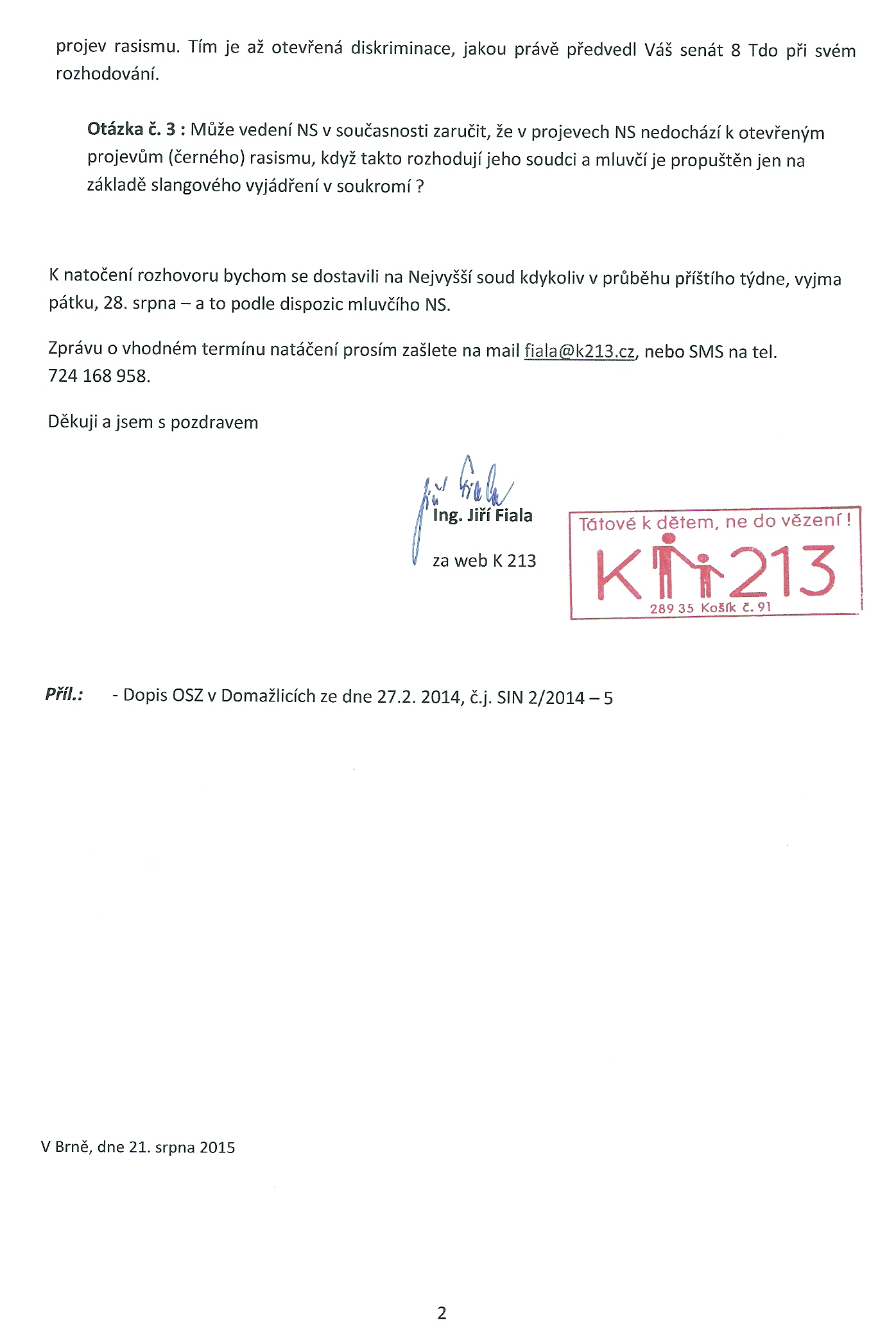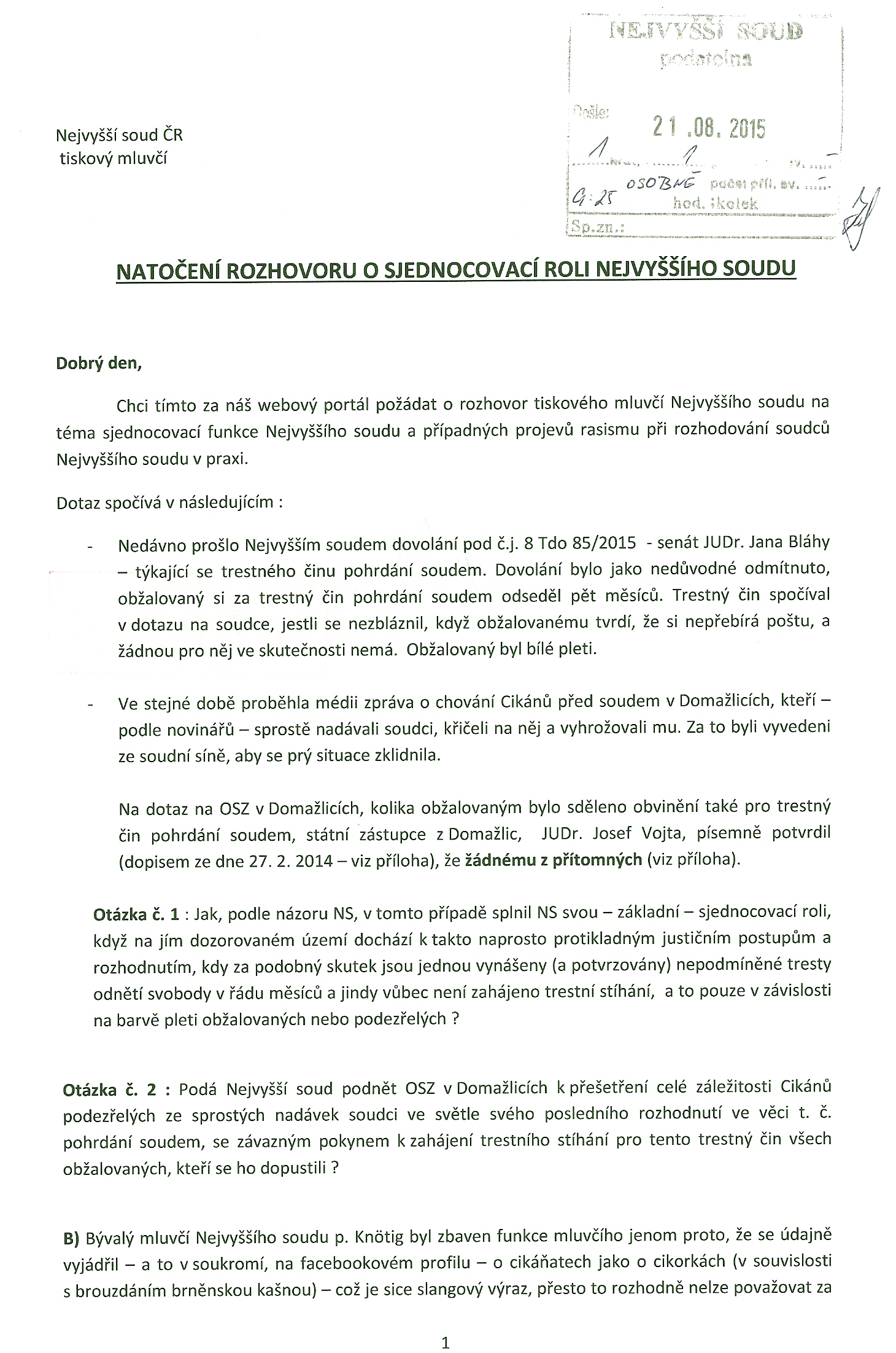 Chci tímto za náš webový portál požádat o rozhovor tiskového mluvčí Nejvyššího soudu na téma sjednocovací funkce Nejvyššího soudu a případných projevů rasismu při rozhodování soudců Nejvyššího soudu v praxi.