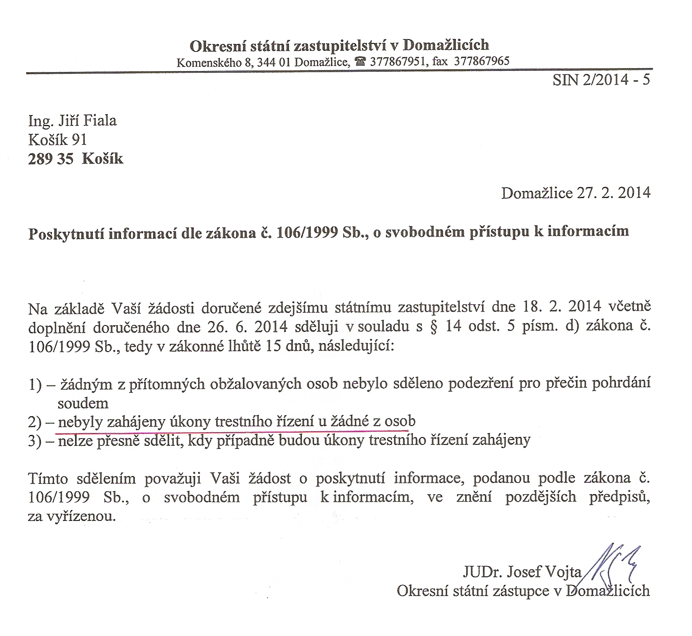 Na dotaz na OSZ v Domažlicích, kolika obžalovaným bylo sděleno obvinění také pro trestný čin pohrdání soudem, státní zástupce z Domažlic, JUDr. Josef Vojta, písemně potvrdil (dopisem ze dne 27. 2. 2014 – viz příloha), že žádnému z přítomných (viz příloha).