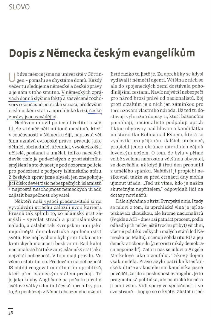 když se podíváte na následující dopis, který přebíráme z evangelického tisku. Je sice - podle názvu - určen českým evangelíkům, ale podle obsahu může klidně směřovat na celou českou veřejnost, ohlupovanou babišovsko-zemanovskou propagandou nenávisti a strachu ze všeho neznámého a cizího, především pak z proudu uprchlíků.
