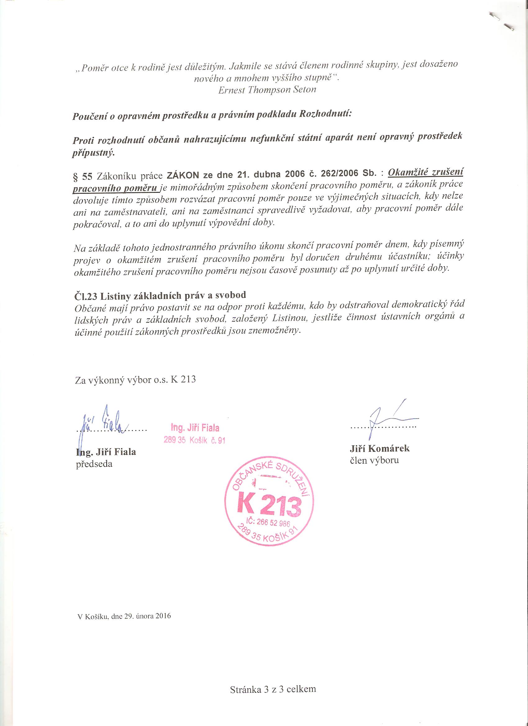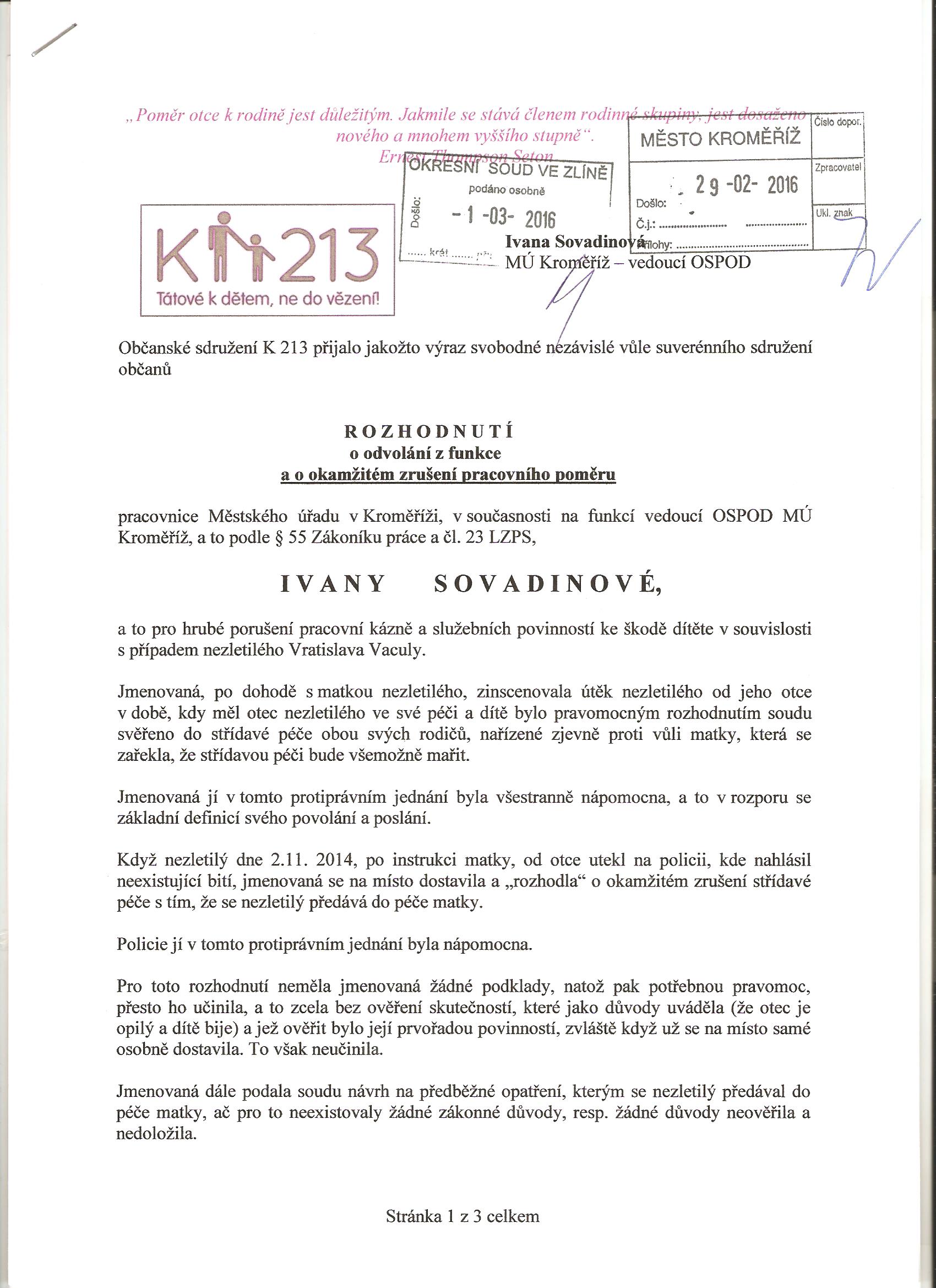 Když už jsme tam byli, tak jsme v Kroměříži předali nadřízené vedoucí OSPOD (ta údajně odjela zrovna na jednání do Brna ... věděli totiž dost dlouho dopředu, že přijedeme ...) rozhodnutí našeho občanského sdružení o zbavení paní Sovadinové funkce vedoucí OSPOD a současně i zrušení pracovního poměru mezi ní a MÚ Kroměříž pro hrubé porušení pracovní kázně a zneužití pravomocí - s tím, že pokud ji ještě v březnu najdeme na úřadě, obsadíme jí kancelář a znemožníme její další činnost, a bude-li to nutné, tak i celý úřad.