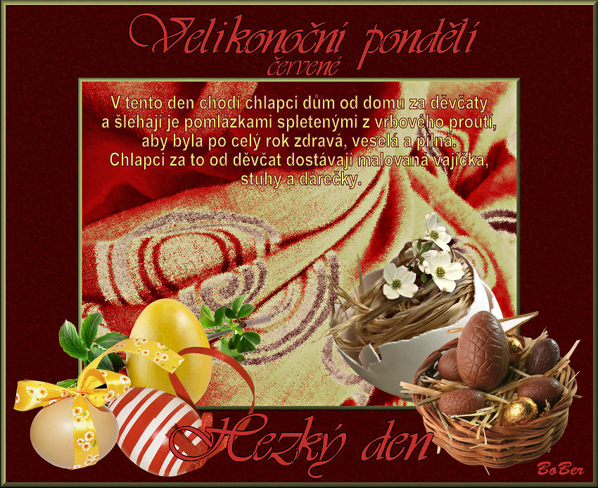 8. velikonoční den - Velikonoční (červené) pondělí - vlastně již všední den, v českých zemích se ujala tradice chození s pomlázkou a vymrskání děvčat. Ta - paradoxně - jako jediná z celého pašijového týdne - přežila a symbolizovala Velikonoce za minulého, ateistického režimu.