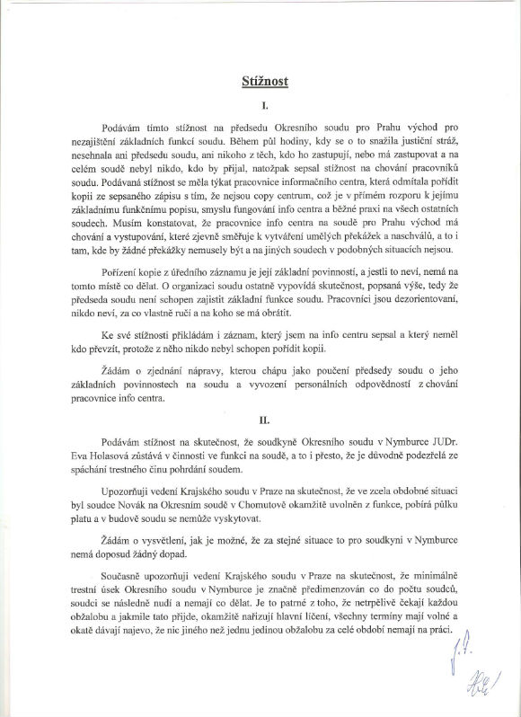 Jak to, že chomutovský soudce Novák nesmí na soud, dostává půlku platu a musí čekat až do rozsudku - a nymburská soudkyně Holasová, prokazatelně spáchavší trestný čin, si klidně sedí dál na soudě a bere plat celý - a navíc zjevně nedělá nic, protože má všechny termíny volné a na každou novou obžalobu čeká jako na spásu boží, aby se jí ihned - dokonce tentýž den - plně věnovala. Natolik plně, že si pak není schopna spočítat ani úložní lhůtu na poště, takže si sama své vlastní hlavní líčení zase zmaří.