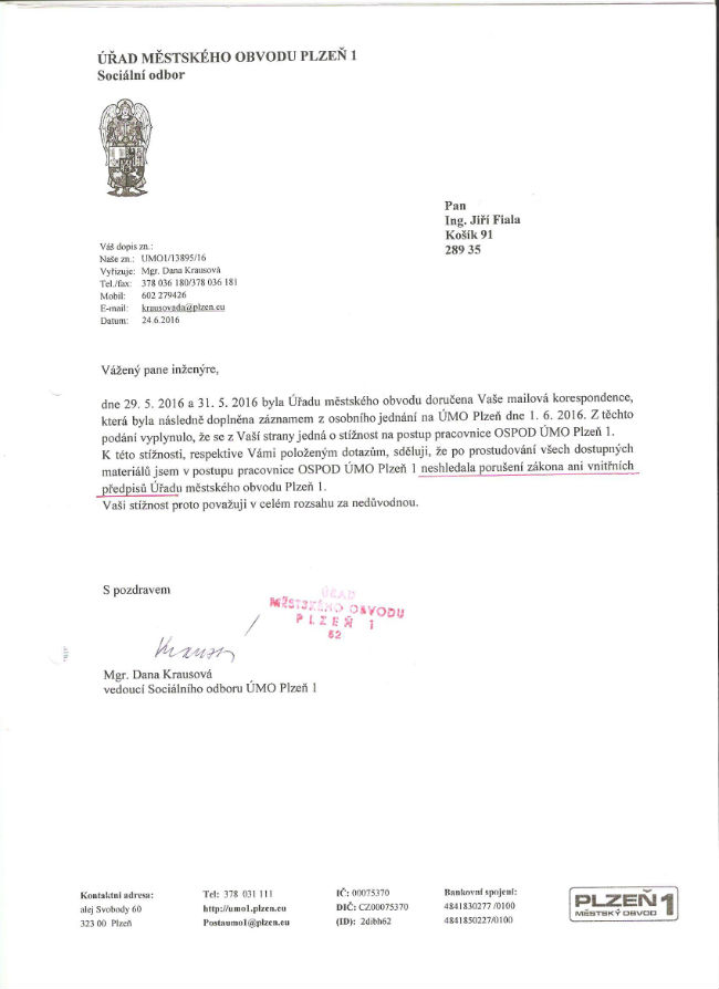Za celý měsíc se UMO 1 v Plzni vzmohl na jedinou větu - a sice že žádný předpis nebyl porušen, což je evidentní lež, protože žádný předpis neukládá OSPOD instruovat rodiče k vědomému porušování pravomocného rozsudku a státní a městské orgány mohou své pravomoce vykonávat jedině v rámci a v mezích daných jim zákonem - musel by tedy přesně takový zákon existovat.