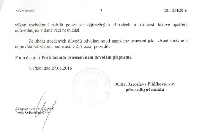 Přesto - ji najdeme v usnesení soudkyně KS v Plzni Jaroslavy Pihlíkové - a je zjevně myšlena smrtelně vážně.