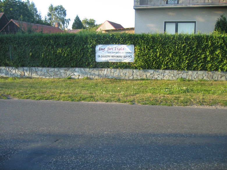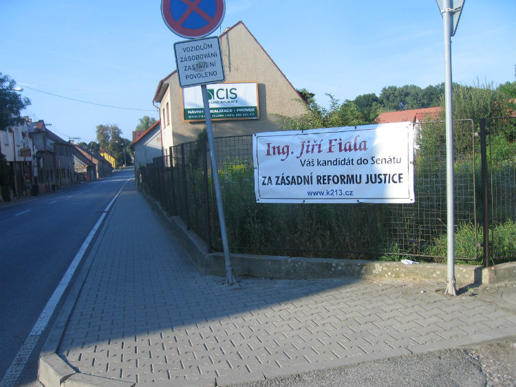 Místo u hřiště se i konkurenci zalíbilo natolik, že pan hrabě vylepil svůj plakát přímo naproti nám (vlevo na plotě náš baner, vpravo, na plotě hřiště, pan hrabě Czernin).