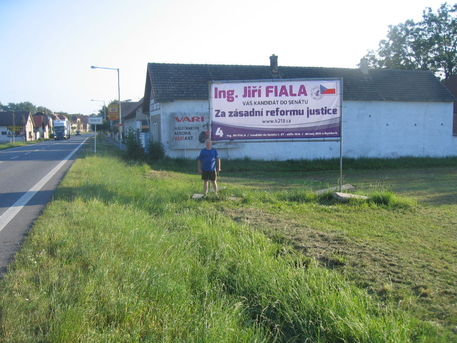 Náš zatím největší baner je umístěn u silnice Jičín - Poděbrady, v Senicích. Tohle je směr na Poděbrady. Pro porovnání velikosti postava muže u něj.