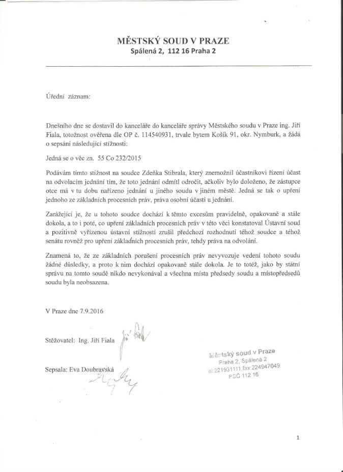 A ZDE ještě úřední záznam z Městského soudu, coby stížnost - opakovaná - na Stibrala, neboť ty předchozí zjevně nikdo neřešil, ač MS má jak svého předsedu, tak i řadu místopředsedů, kteří za to berou peníze. A ne rozhodně malé.