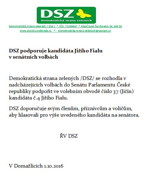 Demokratická strana zelených /DSZ/ se rozhodla v nadcházejících volbách do Senátu Parlamentu České republiky podpořit ve volebním obvodě číslo 37 (Jičín) kandidáta č.4 Jiřího Fialu.