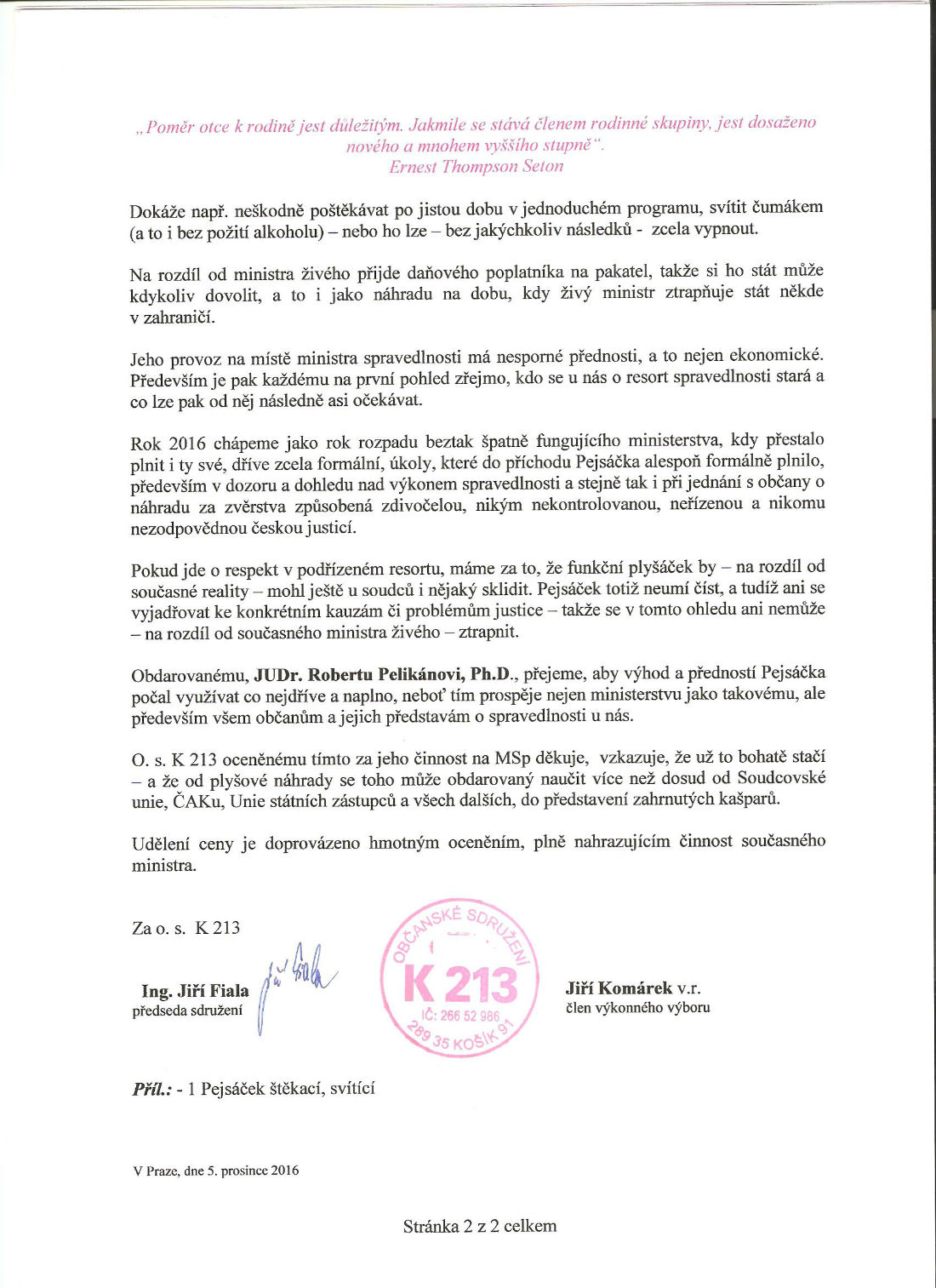 Jak naši čtenáři jistě ví, sdružení K 213 každoročně uděluje cenu "Bílá vrána české justice ", případně "Rypák roku", a to při příležitosti Dne lidských práv, 10. prosince.