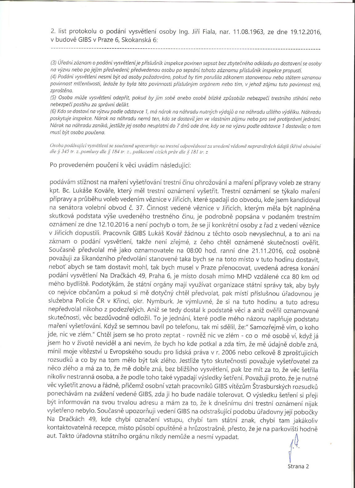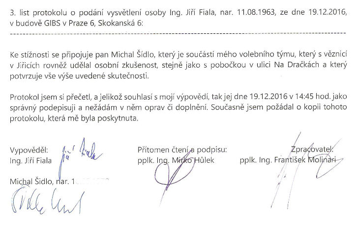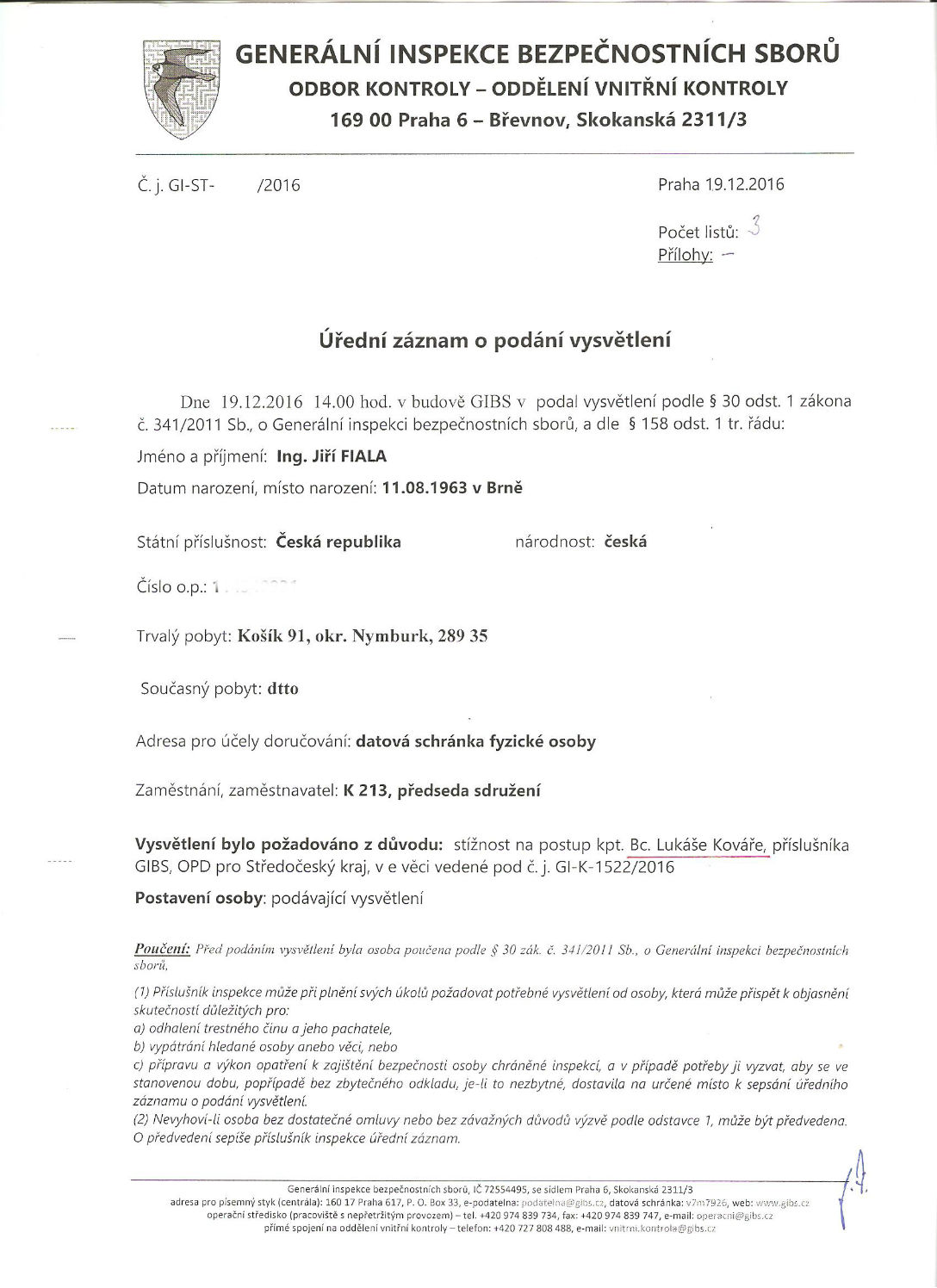 Jak ho šetřily, o tom výmluvně svědčí následující průběh : Nejprve mi GIBS poslal předvolání na 8 hodinu ranní do svého sídla v pražském Veleslavíně (jaká hrůza by mě tam čekala, to jsem naštěstí netušil - ale pro zjevnou nemožnost jsem tam ani nejel, neboť na osmou hodinu ráno se tam můžete dostat jedině tak, že v Praze přespíte. A to jsem ještě netušil, že tam nevede MHD a že to je objekt zcela stranou, dostupný jedině autem. Nebo dlouhou pěší "procházkou". Prostě - likvidační předvolání - tak, aby na ně nebylo možné vyhovět. Krom toho - státní orgány mají povinnost jít za občanem, ne obráceně, od toho je taky hustá struktura státních orgánů vybudována... A pro každého je místně příslušná - při styku s OČTŘ - služebna nejbližší místu jeho trvalého bydliště - takže ne že já měl jet do Veleslavína, ale pokud mi orgány něco chtěly, měly jet za mnou, tedy na pobočku policie v Křinci.