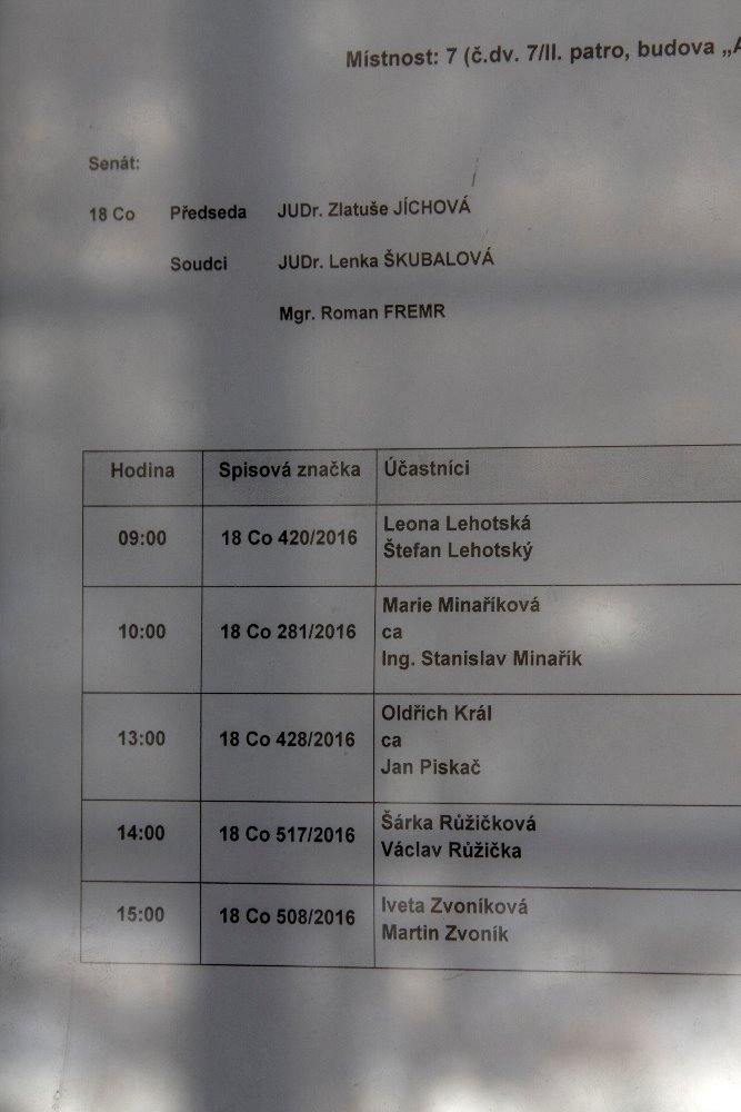 Druhá byla na řadě soudkyně Škubalová, ta se sice schovala za dveře, ale aspoň se snažila odpovědět na otázku. Ptal jsem se jí na příbuznost soudkyně Jíchové s exekutorem Jíchou. Prý o tom sice nic neví, ale dozajista by se vyloučila, kdyby s ním příbuzná byla.