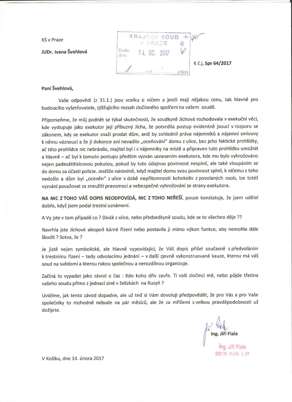 Připomeňme, že můj podnět se týkal skutečnosti, že soudkyně Jíchová rozhodovala v exekuční věci, kde vystupuje jako exekutor její příbuzný Jícha, že potvrdila postup evidentně jsoucí v rozporu se zákonem, kdy se exekutor snaží prodat dům, aniž by zohlednil práva nájemníků a nájemní smlouvy k němu váznoucí a že jí dokonce ani nevadilo „oceňování“ domu z ulice, bez jeho faktické prohlídky, ač této prohlídce nic nebránilo, majitel byl i s nájemníky na místě a připraven tuto prohlídku umožnit a hlavně – ač byl k tomuto postupu předtím vyzván usnesením exekutora, kde mu bylo vyhrožováno nejen padesátitisícovou pokutou, pokud by tuto údajnou povinnost nesplnil, ale také vloupáním se do domu za účasti policie. Jestliže následně, když majitel domu svou povinnost splnil, k ničemu z toho nedošlo a dům byl „oceněn“ z ulice v době nepřítomnosti kohokoliv z povolaných osob, lze totéž vyzvání považovat za zneužití pravomoci a nebezpečné vyhrožování ze strany exekutora.