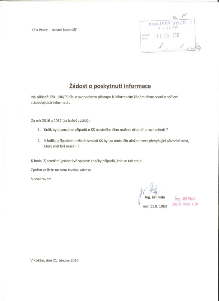 Věřím, že mému podnětu bude věnována náležitá pozornost a že budou vedením soudu přijata nezbytná opatření, především pak odstavení uvedené soudkyně mimo výkon její funkce, a to až do zpracování odborných expertiz a do vyšetření celé záležitosti.