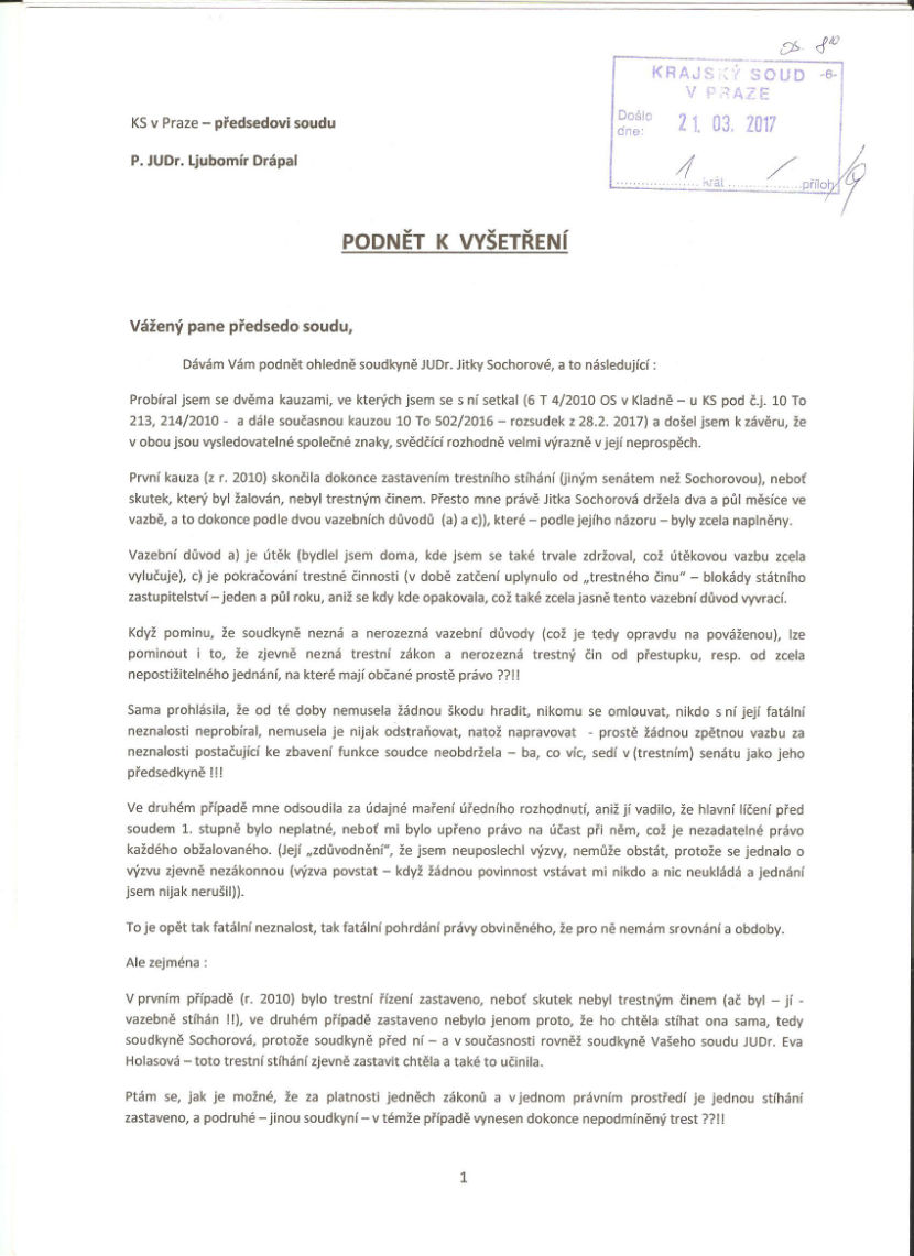 Podnět podán novému předsedovi Krajského soudu v Praze, přišedšího z NS z Brna, Ljubomíru Drápalovi.