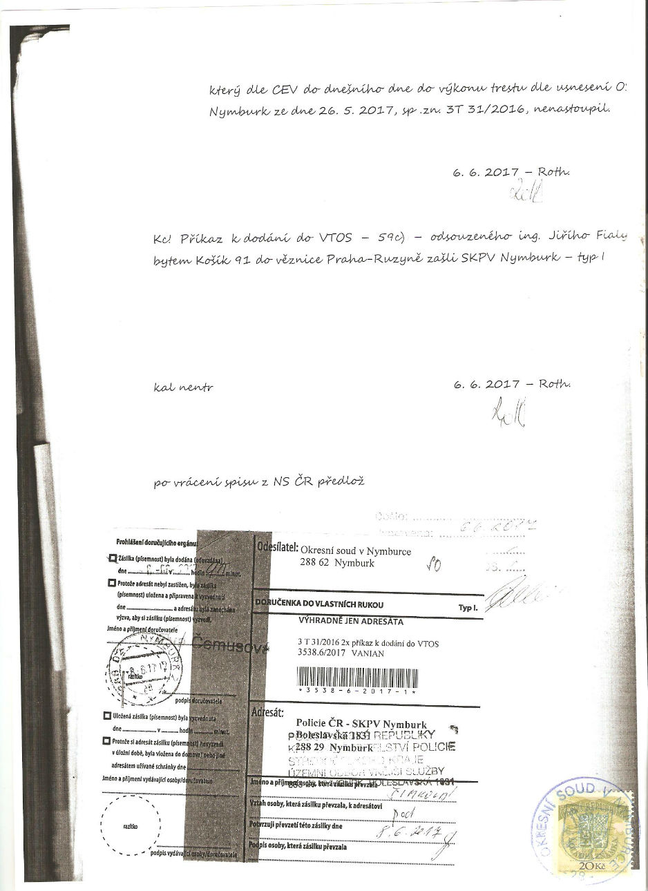 No, a když už jsme měli rozhodné skutečnosti zjištěny - především pak tu, že ve spise - krom neuvěřitelného chlívu - není jediný doklad o tom, že by soudce pověřil vyšší soudní úřednici nějakou takovou činností jako je vyřizování návrhů na odklad nástupu trestu či dokonce vystavení příkazu k dodání do výkonu trestu - tak jsme šli zvesela podat trestní oznámení na nám dobře známé OSZ v Nymburce - spolu se zdvořilou žádostí o okamžité zajištění důkazů (tedy předmětného příkazu k dodání do výkonu trestu) za účelem trestního řízení, neboť tyto důkazy se - podle doručenky - nacházejí i v současnosti v dispozici policie ČR.