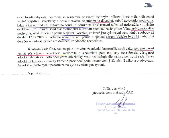 Advokátka pochybila … A jak to, že je advokátkou někdo, kdo ani neví, že musí vyřízení ústavní stížnosti doručit klientovi ??