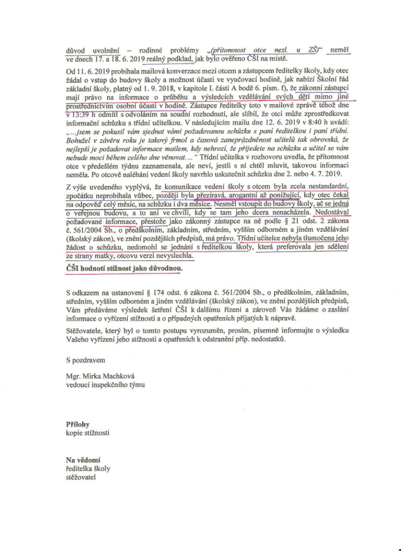 Dodejme, že vzácně pozitivní roli v celém případu sehrála Česká školní inspekce, která praktiky školy nejen podrobně popsala, ale také důrazně odsoudila - a nešetřila přitom slovy, v úředních dokumentech poměrně nezvyklými...