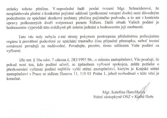 Pokud neshledáváte v podání popsaných skutečnostech žádný trestný čin (viz např. tvrzení, že p. Šídlo vyráběl pojistné podvody, ač zjevně žádné nevyráběl, nevyžádání si podkladů k vlastnímu pojistnému podvodu svědkyně, ač bylo OSZ sděleno, kde je věc šetřena a pod jakým č.j. a otevřené lhaní před soudem, často identifikované ještě během výpovědi), pak je Vaše vzdělání nejen bezcenné, ale přímo škodlivé, protože lidé bez tohoto vzdělání tuto trestnou činnost snadno a bezpečně rozeznají, včetně její společenské nebezpečnosti, kdy po poučení svědka – před soudem – tato lže jako když tiskne, což zesměšňuje především soud samotný.