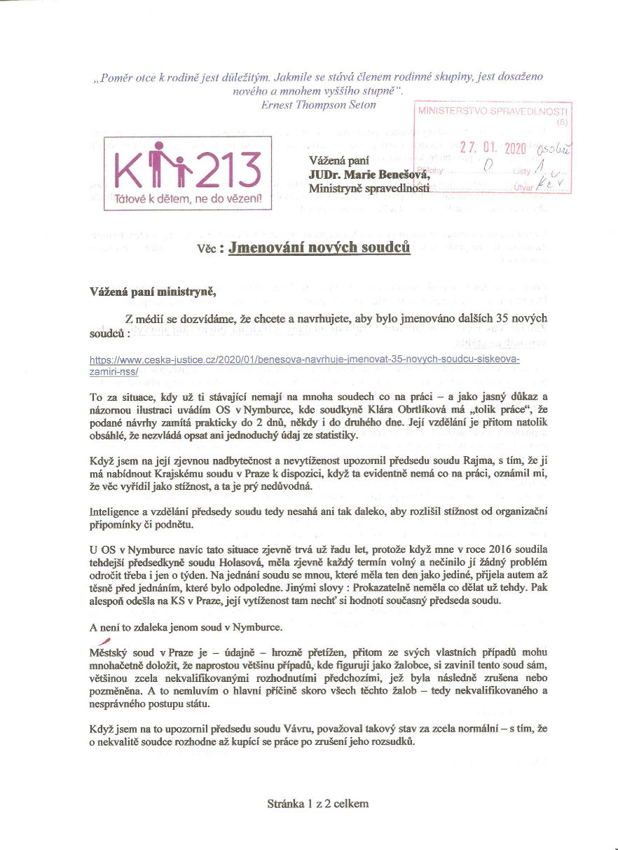 Dopis ministryni spravedlnosti Benešové ke jmenování nových soudců.