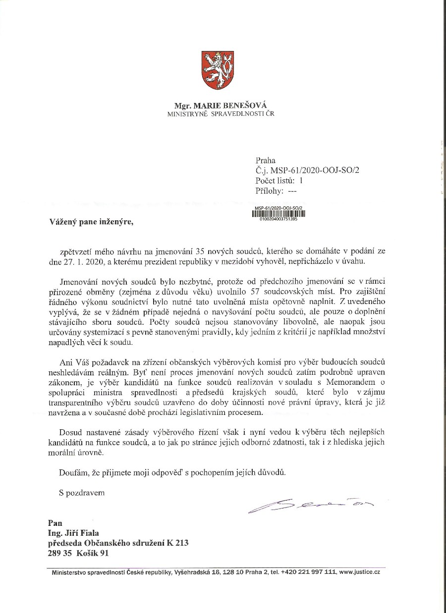 Těší mě, že z Vašeho dopisu vyplývá tak zásadní skutečnost, jako že výběr nových soudců není dosud vůbec nijak upraven a záleží tedy jenom na vůli (nebo libovůli) předsedů krajských soudů, koho soudcem jmenovat navrhnou a koho ne, přičemž ani nemusí zdůvodňovat, proč vůbec nového soudce potřebují.