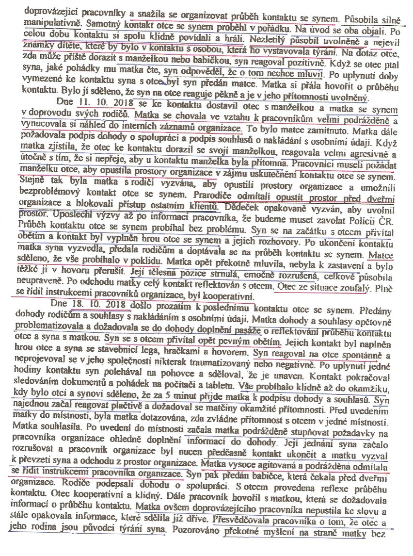 Je to zpráva z průběhu asistovaného styku. Ten nařídil soud - poté, co dítě mělo popáleniny, sice nejprve tvrdilo, že spadlo do ohně, ale později, po návratu od matky, vyrukovalo s tvrzením, že prý ho pálil děda doutníkem. A že ho týrá i jeho otec.