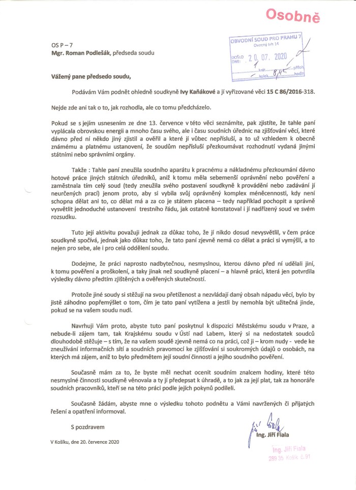Předsedovi soudu pro Prahu 7 byl podán podnět ohledně soudkyně Kaňákové, která - podle svého obsáhlého usnesení - věnovala celé dva měsíce práce nejen své, ale hlavně soudních úřednic ke zjišťování a ověřování údajů, jež už dávno předtím ověřil a zjistil někdo jiný, tím - na rozdíl od Kaňákové - pověřený. Týkaly se mých příjmů a majetkových poměrů.