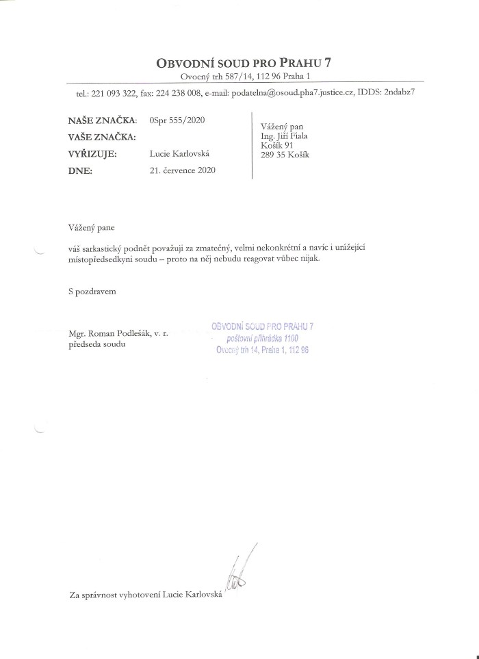 Protože předsedové soudů jsou tam od toho, aby nejen odpovídali na dopisy, ale aby také řešili problémy či podněty v nich obsažené, zvláště když jsou podrobně zdůvodněny, usoudil jsem, že tento předseda soudu je zadarmo drahý, protože neplní svoje základní povinnosti při správě soudu - a napsal jsem to jak jemu, tak i Domovnici, která se dušuje tím, že prý "věnuje maximální pozornost výběru předsedů soudů" - pročež je tedy velmi zvláštní, jak je možné, že na těchto postech potkávám prakticky výhradně nepoužitelné a neschopné nuly, které dokonce ani neumí odpovědět na úřední podnět, natož ho věcně vyřešit.