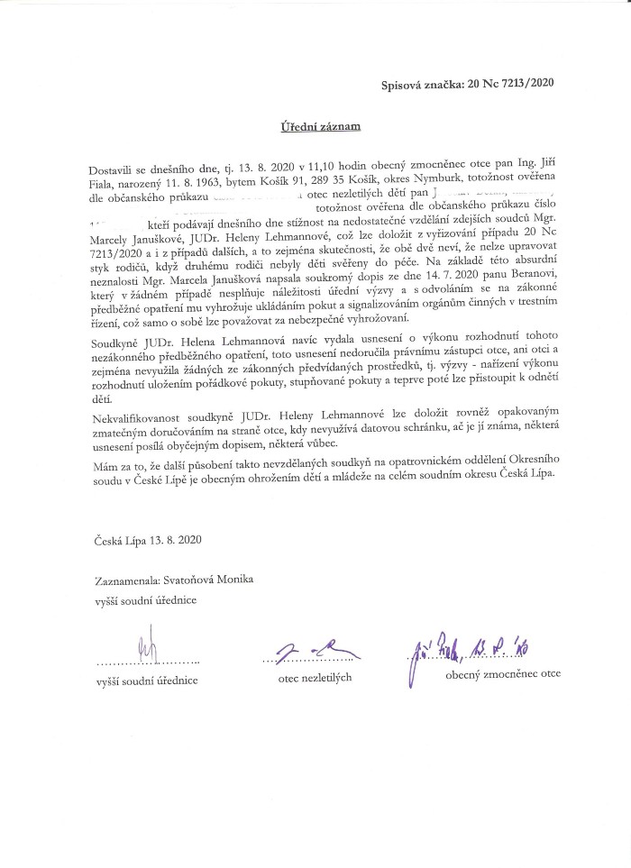 Místně nepříslušný soud v České Lípě nařídil v této věci výkon zjevně nezákonného rozhodnutí (předběžného opatření soudu) odnětím dětí z péče otce, aniž byly tyto děti svěřeny do péče druhého rodiče (zde matky). Tento výkon měl proběhnout dne 22.7. 2020 – a OSPOD Nový Bor se ho iniciativně účastnil.