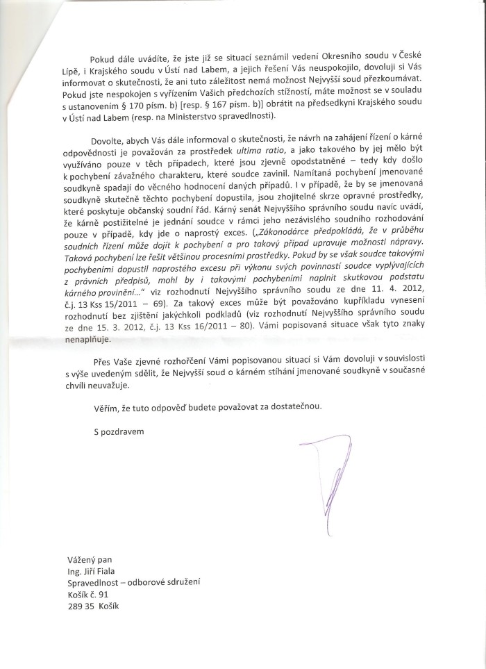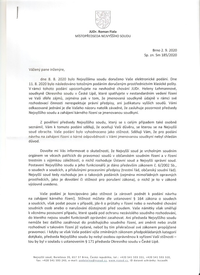 Obracím se na Vás jako na předsedu Nejvyššího soudu, osobu s jednoznačným právem navrhovat kárná řízení vůči soudcům všech nižších stupňů soudů, s podnětem na podání takového kárného návrhu vůči osobě soudkyně OS v České Lípě JUDr. Heleně Lehmannové, a to z důvodů, o nichž se domnívám, že bohatě postačují k navržení odvolání z funkce soudkyně.