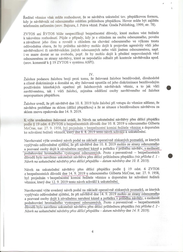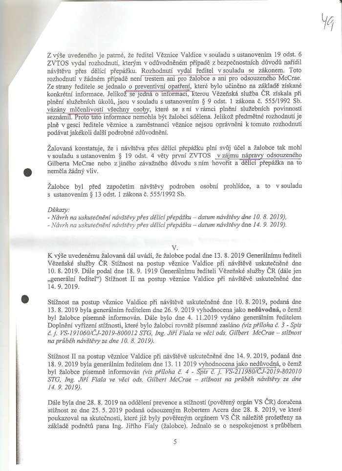 Obsahuje už dříve známé stanovisko žalované, že věznice Valdice obdržela, prostřednictvím jakési operativní služby, supertajnou informaci, kterou nesmí sdělit ani dnes soudu - a podle které důvodem přijatých opatření bylo podezření z přípravy rozsáhlé vzpoury vězňů během návštěvy žalobce za odsouzeným McCraeem v srpnu a září 2019.