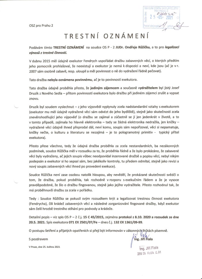 A protože mi přišel postup soudce Růžičky jako evidentní legalizace výnosů pocházejících z trestné činnosti (exekutora), o které musel vědět, podal jsem na něj v tomto smyslu také trestní oznámení. Ano, tomu OSZ P - 2, které nikdy nic nevyšetřilo, a pokud jde o trestnou činnost soudců či exekutorů, považuje ji za samozřejmou součást běžné praxe, nad kterou ani nemá smysl se pozastavovat. Přesto má smysl tato trestní oznámení i nadále podávat. Brzo je budou vysvětlovat, stejně jako to, proč nic neudělali, když o všem včas věděli.